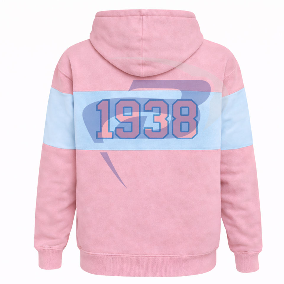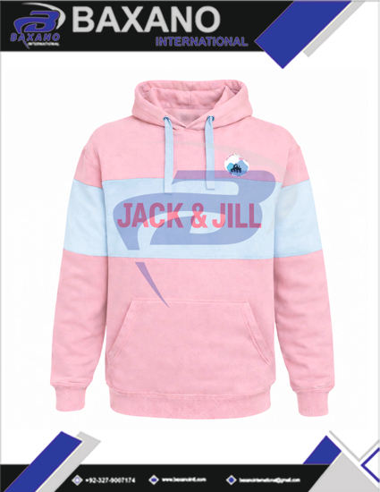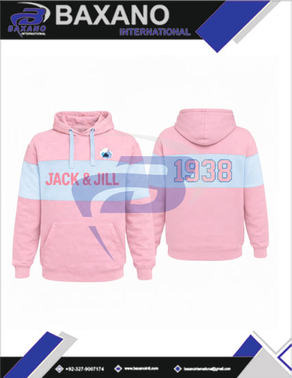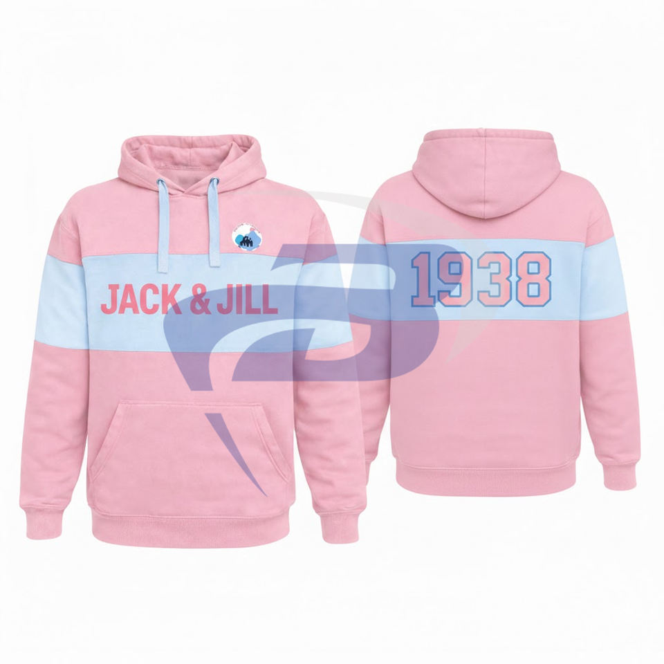 เสื้อฮู้ดแจ็คแอนด์จิลออฟอเมริกา ซอร์โรริตี้ พาแนล ฮู้ดดี้ สีชมพูและฟ้าอ่อน สำหรับฤดูหนาว ดีไซน์ปักลายแบบครอปปิ้ง พร้อมขอบปักลาย สำหรับชุดนักศึกษา