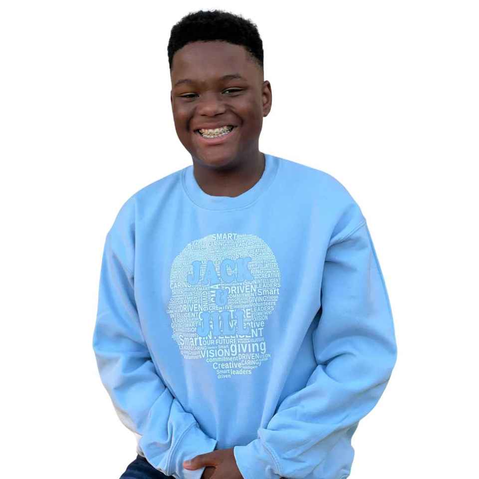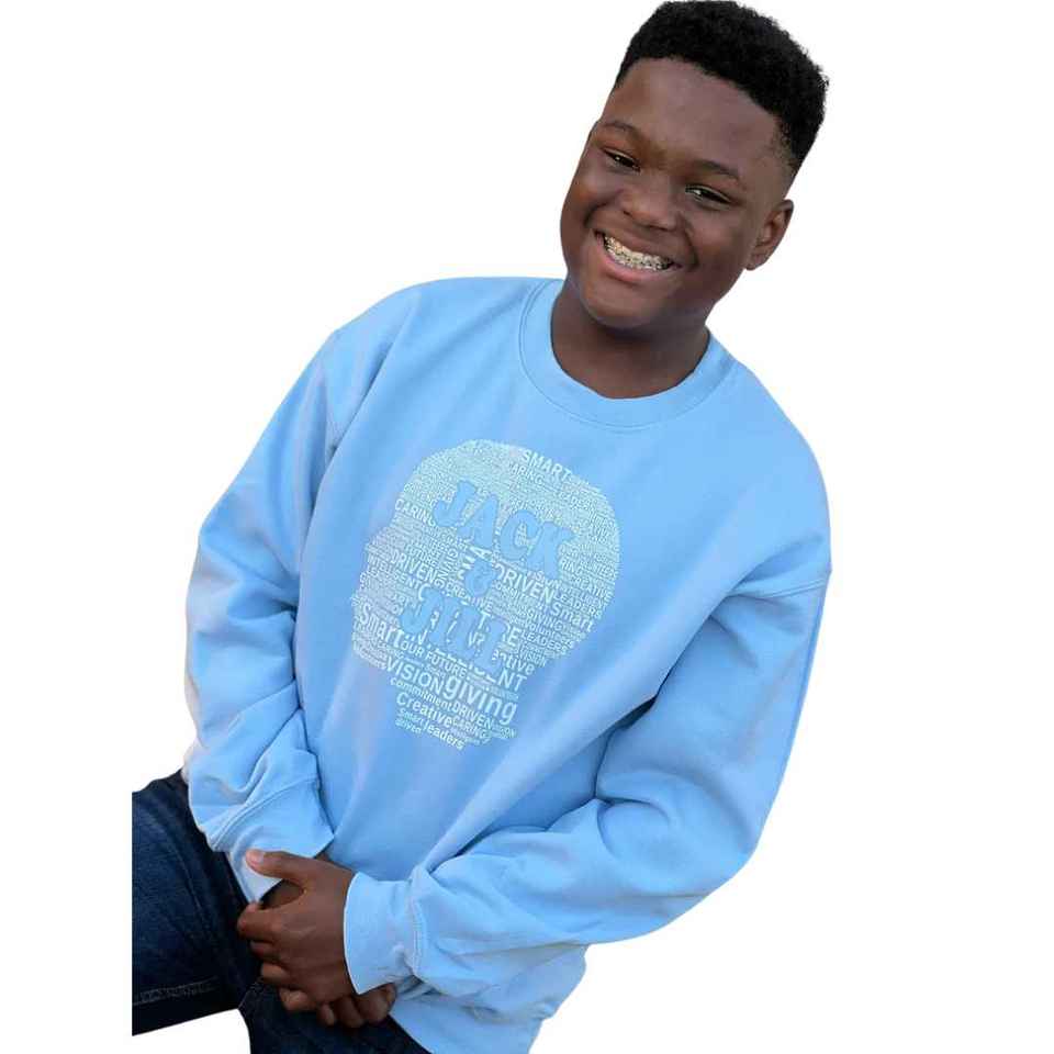 แจ็คแอนด์จิลเสื้อสเวตเตอร์คอกลมสีน้ำเงินลายกราฟิกคลาวด์เวิร์ดสำหรับผู้ชายและผู้หญิงเสื้อสเวตเตอร์แขนยาวสวมใส่สบายๆ