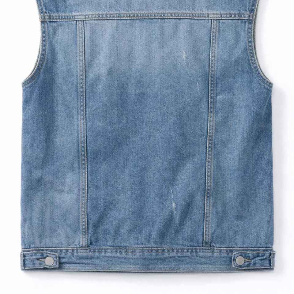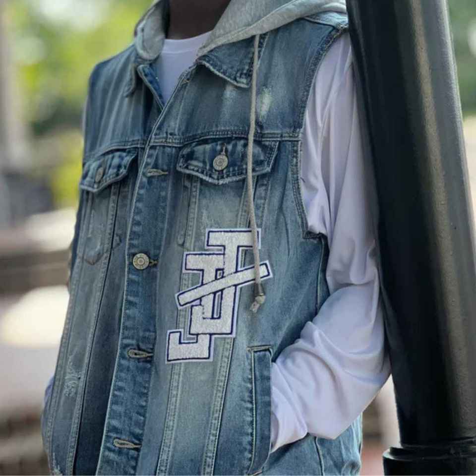 เสื้อกั๊กยีนส์มีฮู้ดสำหรับผู้ชาย แจ็คแอนด์จิล ปักโลโก้ตามสั่ง รับผลิตแบบ OEM ขายส่ง
