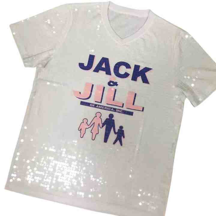 เสื้อยืดแขนสั้นสีเทาประดับเลื่อมสำหรับผู้หญิง ลายแจ็คแอนด์จิล แฟมิลี่ แบบสั่งทำพิเศษ ตกแต่งด้วยเลื่อมสไตล์กรีก เสื้อผ้าแฟชั่นลำลอง