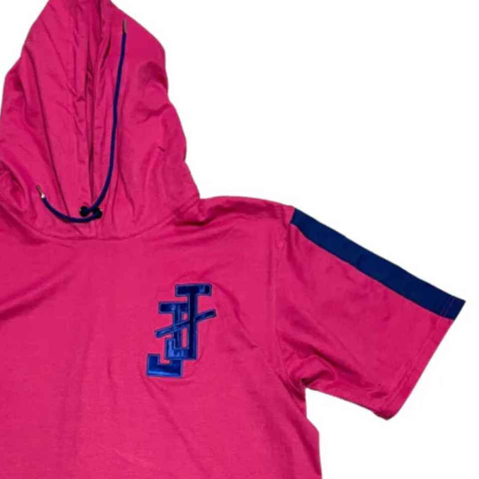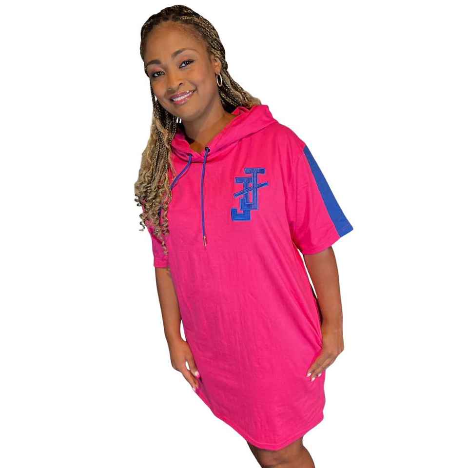 ชุดเดรสฮู้ดดี้แจ็คแอนด์จิล สีชมพู แขนสีน้ำเงิน พร้อมโลโก้ ชุดเดรสฮู้ดดี้สวมใส่สบายสำหรับผู้หญิงและวัยรุ่น ชุดเดรสฮู้ดดี้ทันสมัย