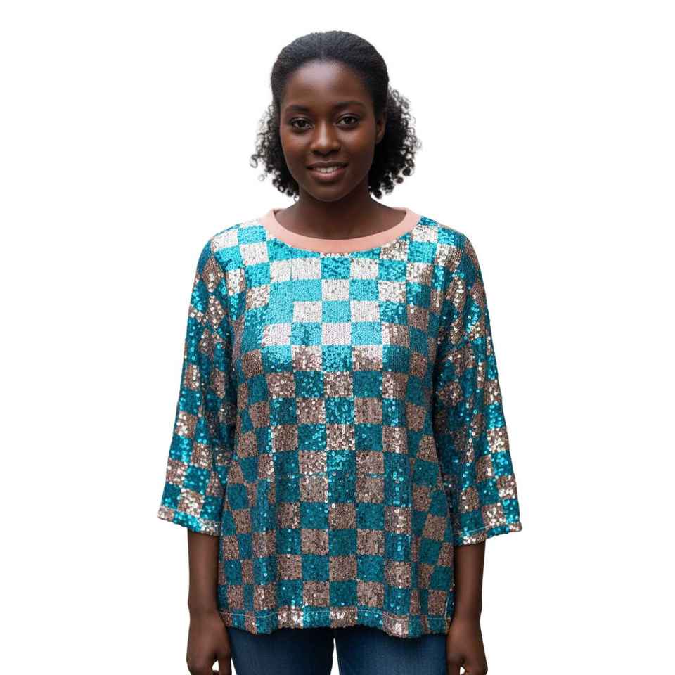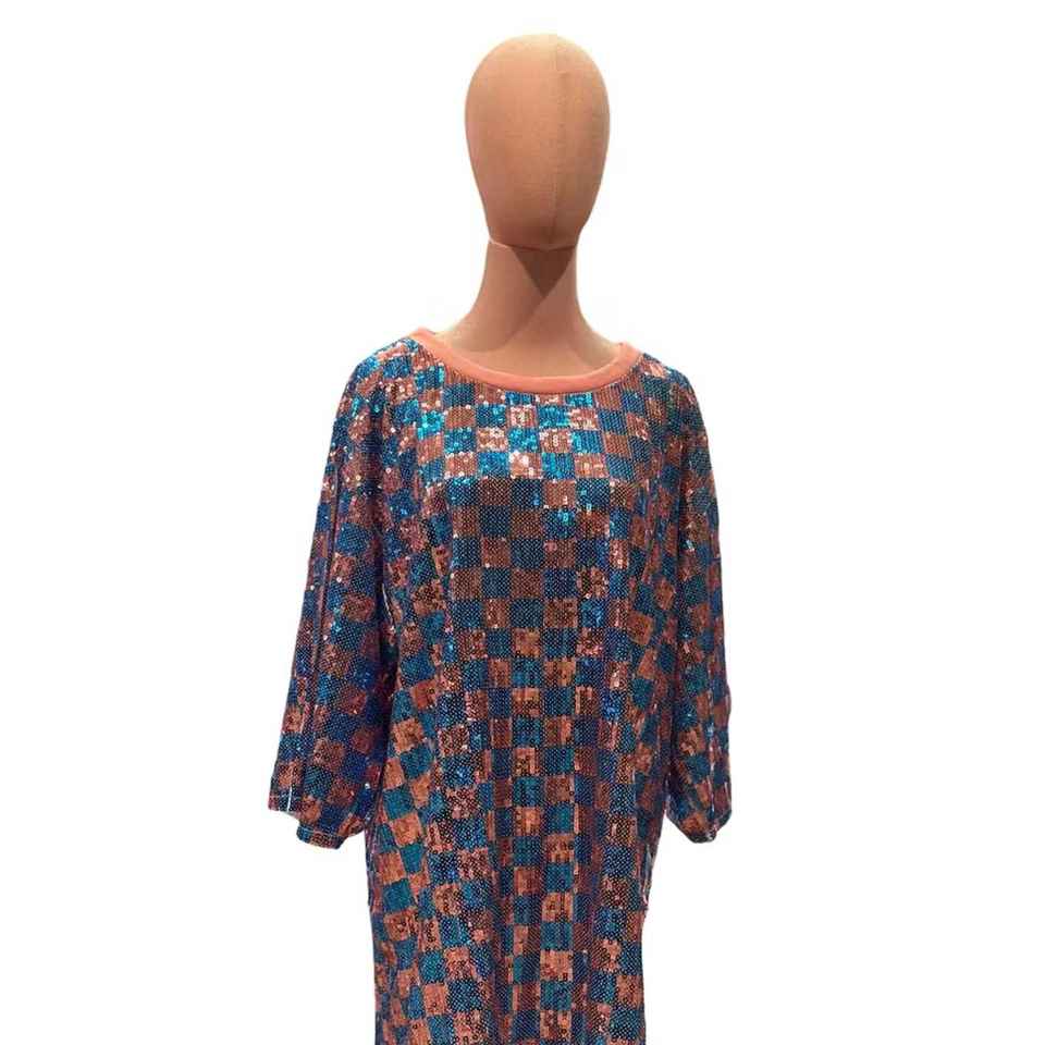 แจ็ค จิล ซีควินชุดเดรสลายตารางหมากรุกผู้หญิงแขนสามส่วนประกายวิบวับ ทรงหลวมลำลองวินเทจคุณภาพสูงแฟชั่นปาร์ตี้