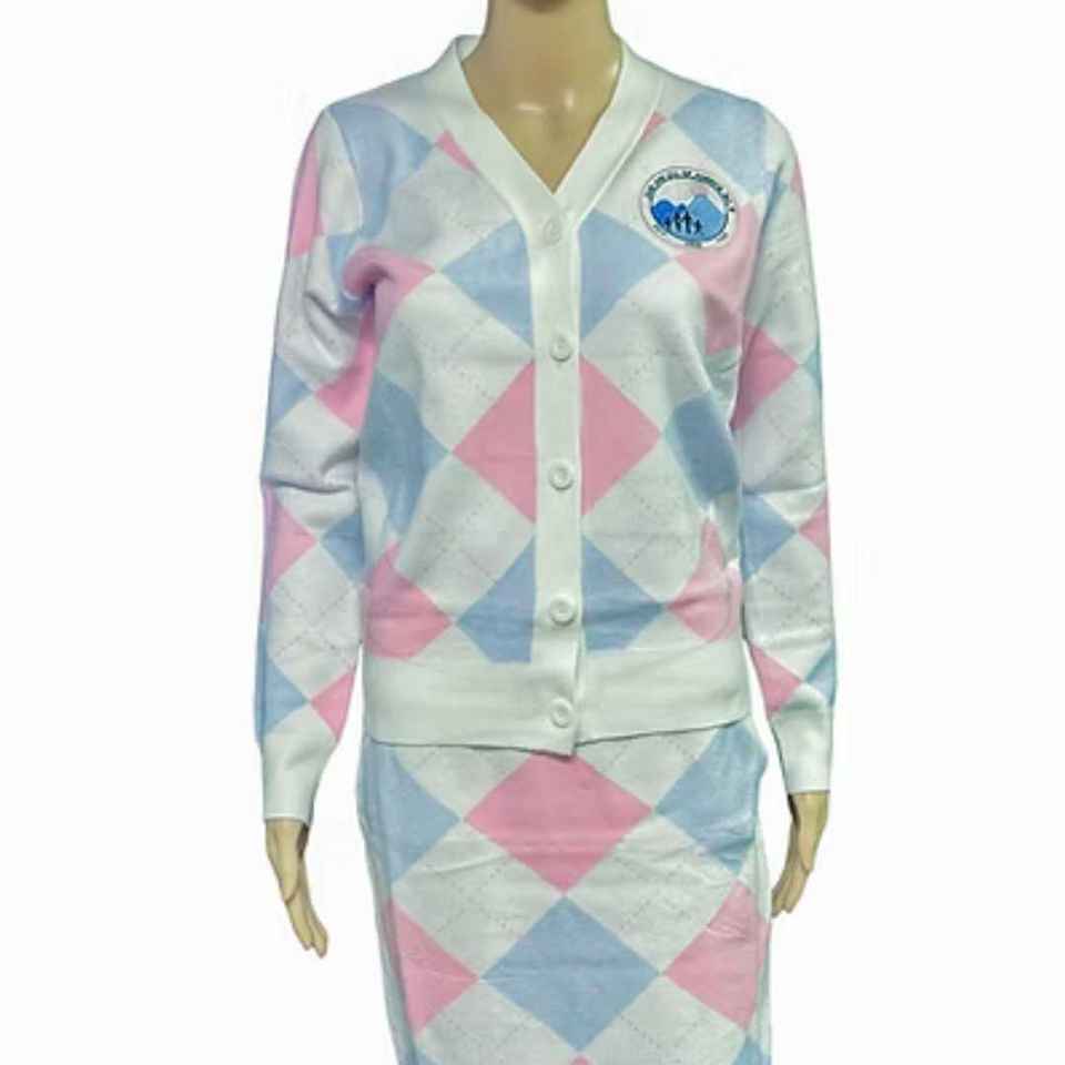 ชุดเซ็ตไหมพรมลายอาร์ไกล์ 2 ชิ้น แจ็คแอนด์จิล สำหรับผู้หญิง เสื้อคาร์ดิแกนคอวีติดกระดุม และกระโปรงทรงดินสอ ชุดเข้าชุดกัน รับทำโลโก้ตามสั่ง ขายส่ง