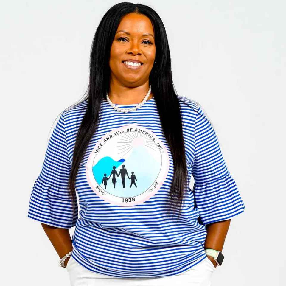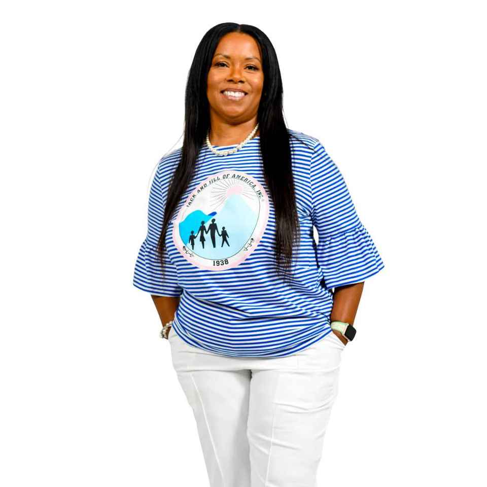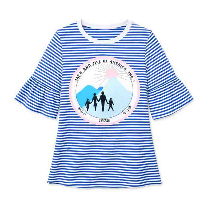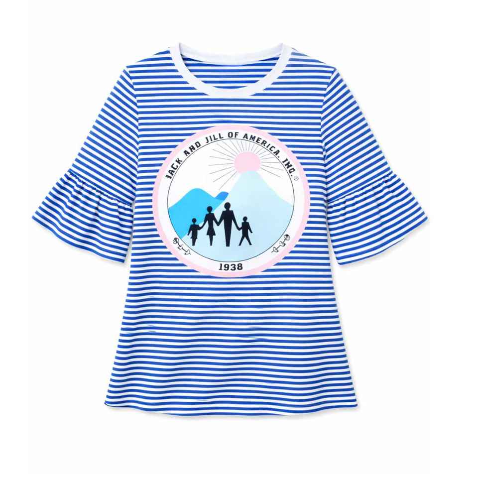 เสื้อยืดแขนกระดิ่งลายทางสีน้ำเงินสำหรับผู้หญิง ยี่ห้อ Jack and Jill คอกลม พิมพ์ลายกราฟิก แฟชั่นทันสมัย รับผลิตแบบ OEM ขายส่งจำนวนมาก