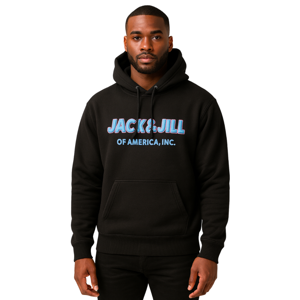 แจ็คแอนด์จิลแห่งอเมริกาสีดำเสื้อสวมหัวมีฮู้ดปักลายกำมะหยี่สีฟ้าเสื้อผ้าสำหรับองค์กรซีวิคและมืออาชีพ