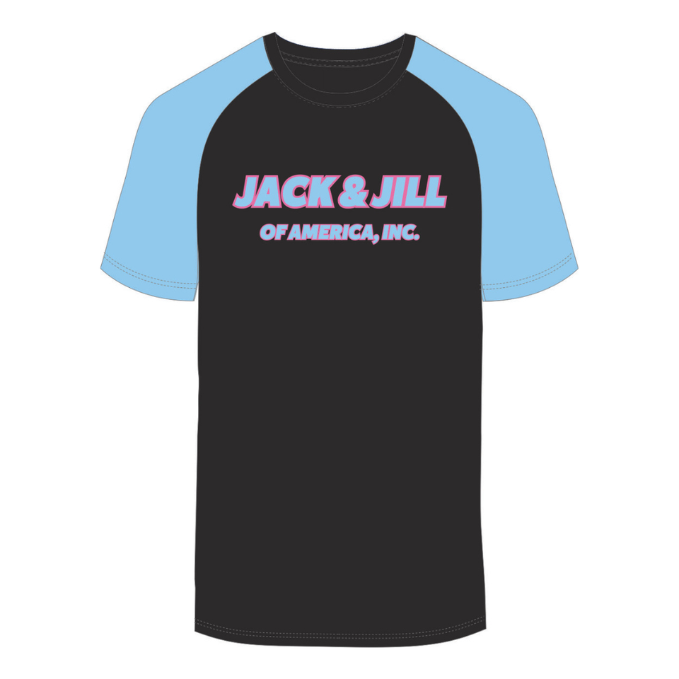 เสื้อยืดแขนแร็กแลนแจ็คแอนด์จิลล์ของอเมริกาสีดำปักลายด้วยกำมะหยี่สีฟ้าเสื้อผ้าสำหรับมืออาชีพสีดำ & Civic
