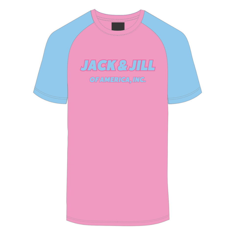 เสื้อยืดแขนแร็กแลนแจ็คแอนด์จิลของอเมริกาสีชมพูปักลายด้วยกำมะหยี่สีฟ้าเสื้อผ้ามืออาชีพสีดำ & Civic