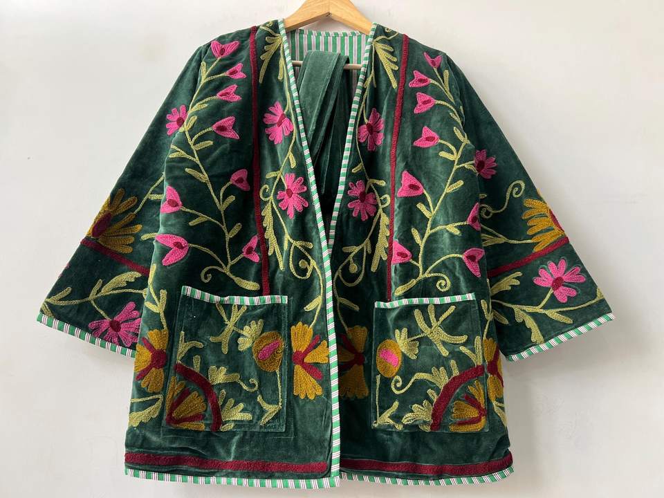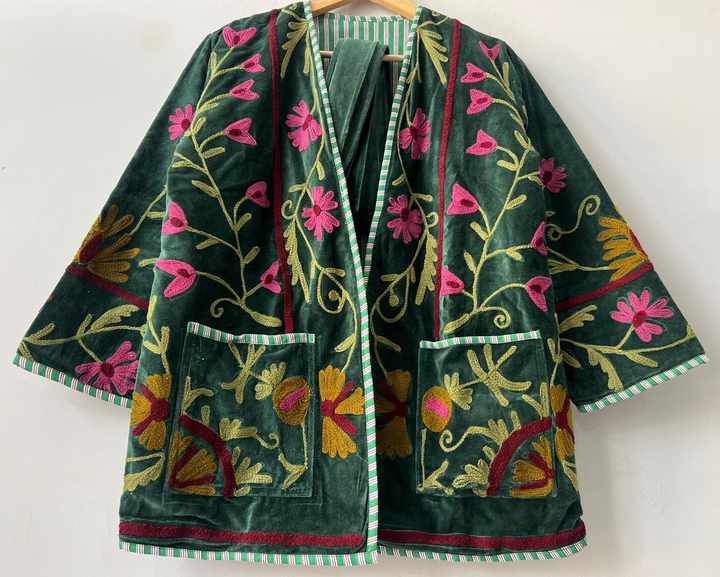 เสื้อแจ็คเก็ตกำมะหยี่สีเขียวถักลายปักลายดอกไม้แบบสั้นทรงบอมเบอร์พร้อมเข็มขัดสไตล์โบโฮซูซานีแบบกลับด้านได้เสื้อคลุมตัวนอกที่โดดเด่น