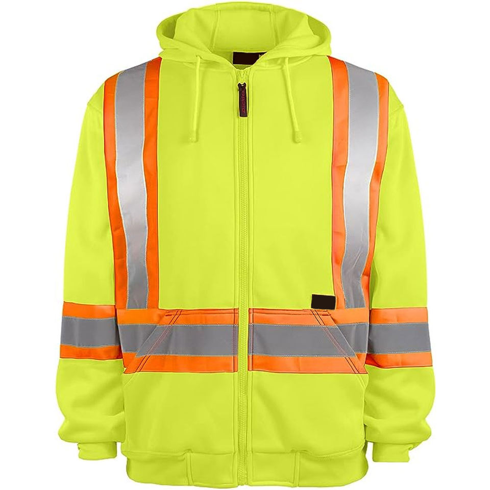 เสื้อแจ็คเก็ตมีฮู้ดแบบซิป เสื้อฮู้ดแบบสวมหัว เสื้อสเวตเชิ้ตแบบมีฮู้ด สีเหลืองสะท้อนแสง เสื้อฮู้ดนิรภัยราคาถูก สำหรับผู้ชายและผู้หญิง