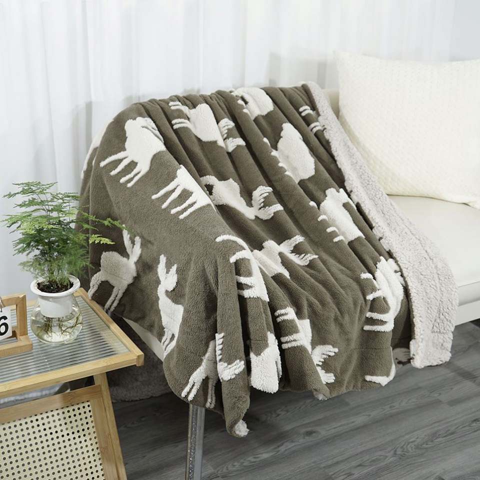 ผ้าห่มขนแกะแจ็คการ์ดผ้าห่มนุ่มอุ่นสบายพร้อมดีไซน์3D รูปสัตว์สำหรับตกแต่งบ้าน (สีกากี)