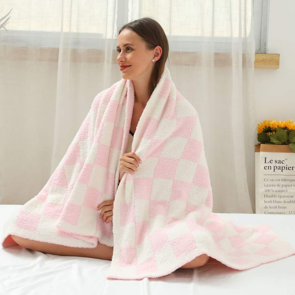 ผ้าห่มผ้าสักหลาดลายตารางหมากรุกผ้ากำมะหยี่แบบครึ่งผ้าแจ็คการ์ดสีดำสีขาวคลุมเต็มตัวสำหรับโซฟาอุปกรณ์วันหยุด