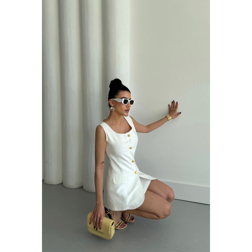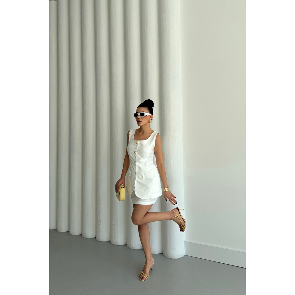 ชุดเสื้อกั๊กผ้าลินินลายแจ็คการ์ดและกระโปรงสั้นสำหรับผู้หญิง สีขาว