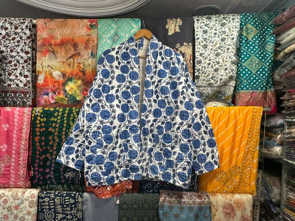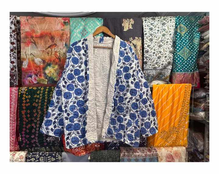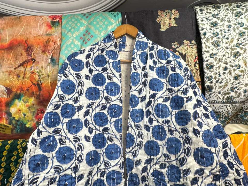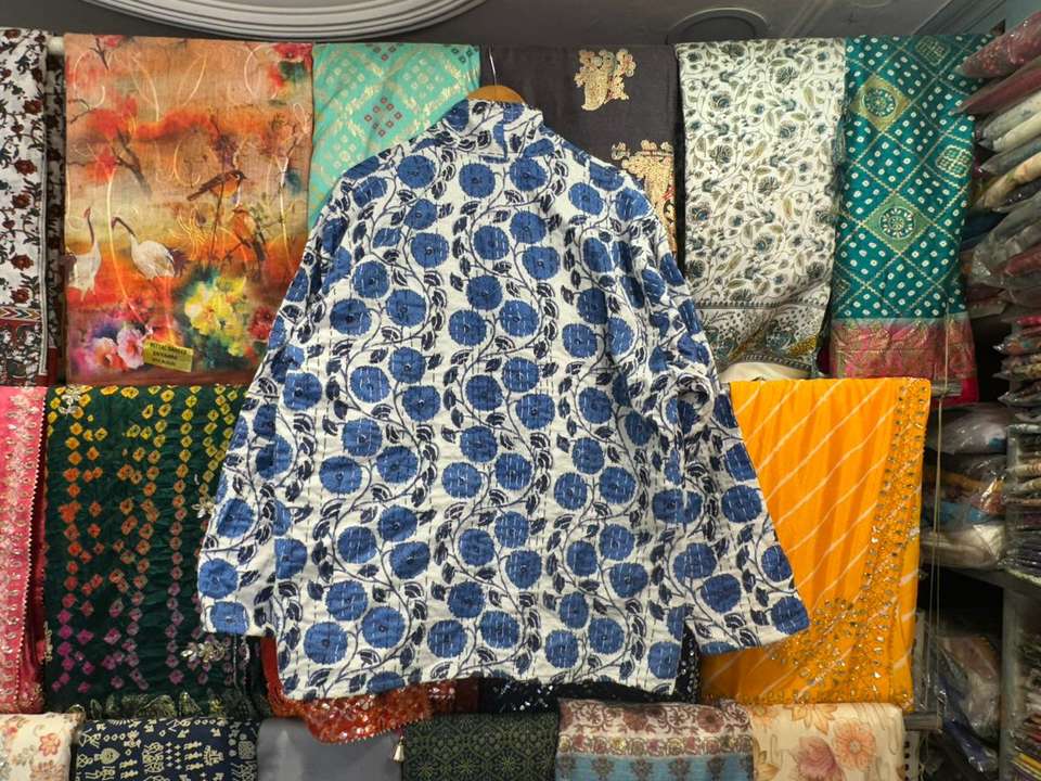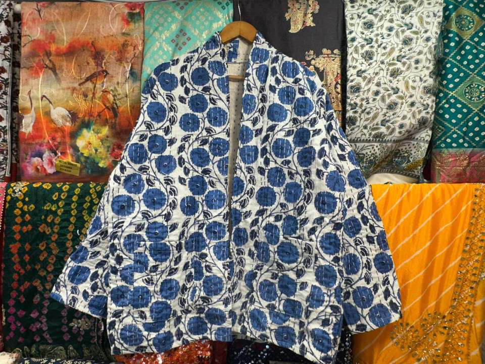 เสื้อแจ็คเก็ตผ้าฝ้ายเย็บมือแบบกลับด้านได้ รุ่น New Kantha จาก Jaif Textiles ความยาวปกติ เป็นมิตรกับสิ่งแวดล้อม ปิดด้วยกระดุมเขาสัตว์ สำหรับผู้หญิง