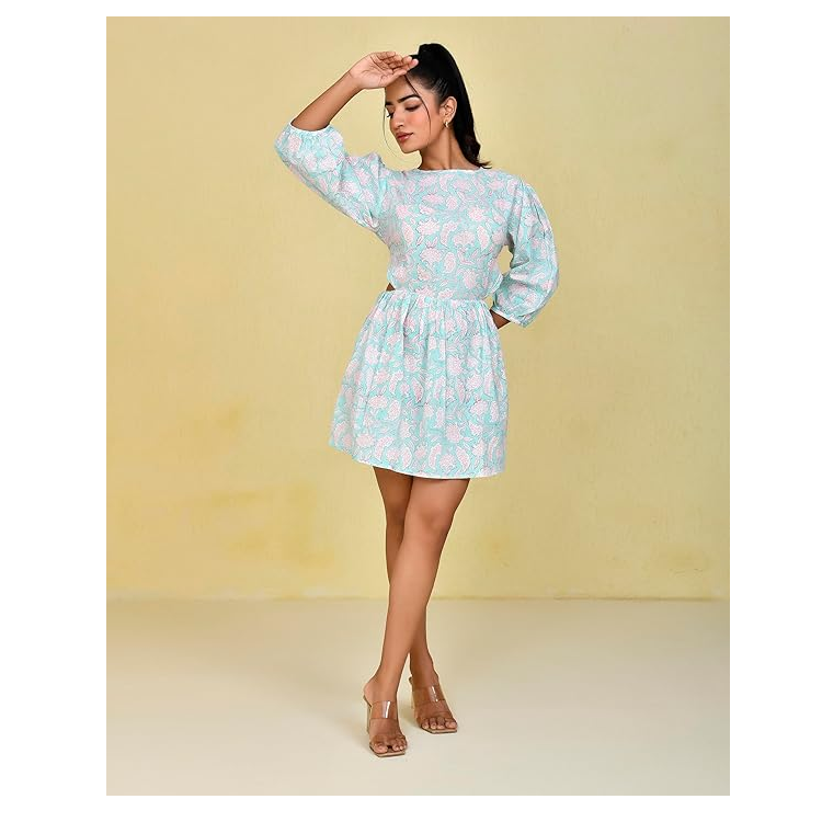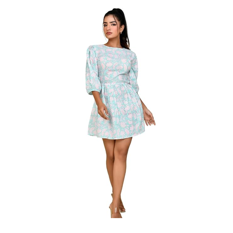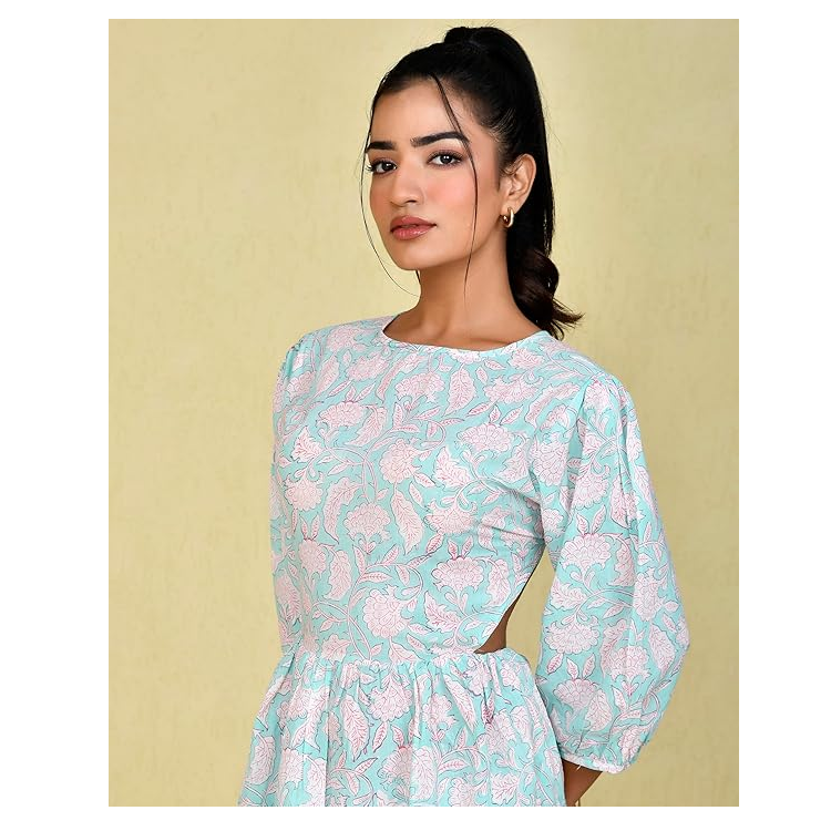 Jaipuri เดรสลำลองฤดูร้อนลายดอกไม้สีฟ้าและสีขาวพิมพ์ลายดอกไม้