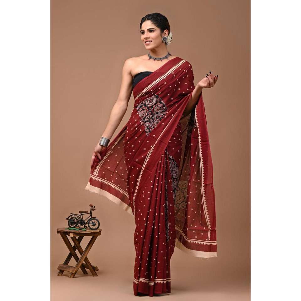 ผ้าซารีเนื้อนุ่มสไตล์ชาวชาวเผ่าชาวชาวปุระ ผ้าพิมพ์ลายชาวปุระแท้ ผ้าคอตตอนเนื้อหนัก ผ้าจอร์เจตต์เน็ต งานปักลายแบบชาวปุระ รุ่นบาเนราสี สำหรับผู้หญิง