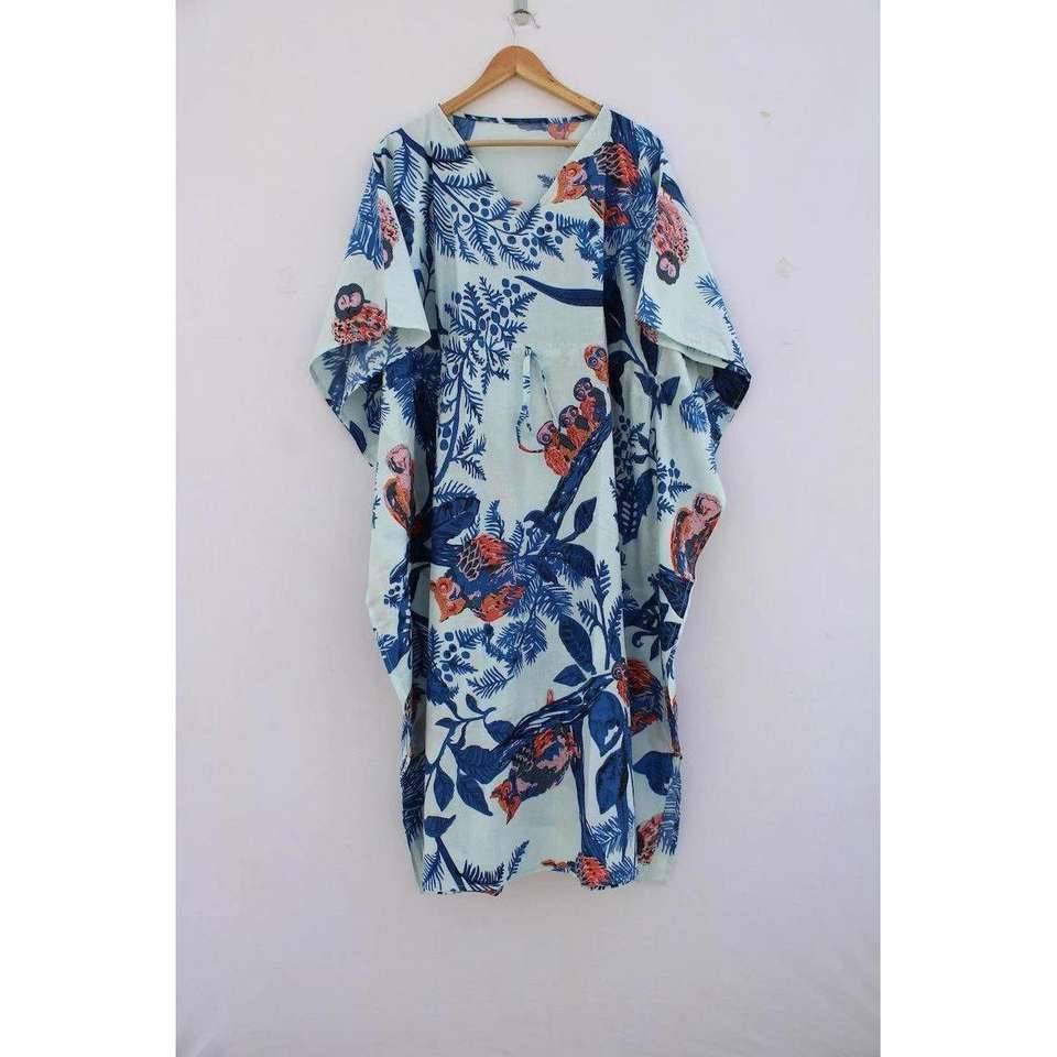 ชุดเดรสผ้าฝ้ายพิมพ์ลายแบบชาวชาวรุรุปุรี ทำมือ คอสูง แขนสั้น ลายดอกไม้ พิมพ์ลายบล็อก ชุดนอน เสื้อคลุมชายหาด ชุดคลุมชุดว่ายน้ำ