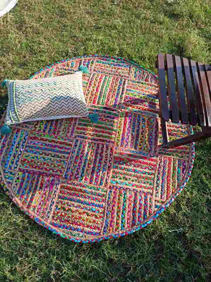 Jaipuri พรมสไตล์ดีไซน์เนอร์หลากสีและลวดลายงานปักที่ยอดเยี่ยมพรมทรงกลมทำจากผ้าฝ้าย100% สำหรับตกแต่งบ้าน