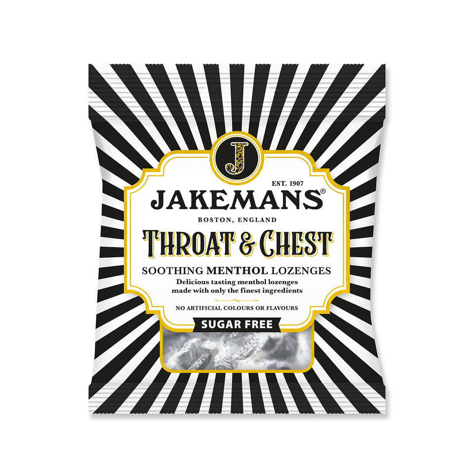 Jakemans คอและคอร์เซ็ตหน้าอก73กรัมปราศจากน้ำตาลให้เมนทอลที่แข็งแกร่งเพื่อการบรรเทาอย่างรวดเร็ว
