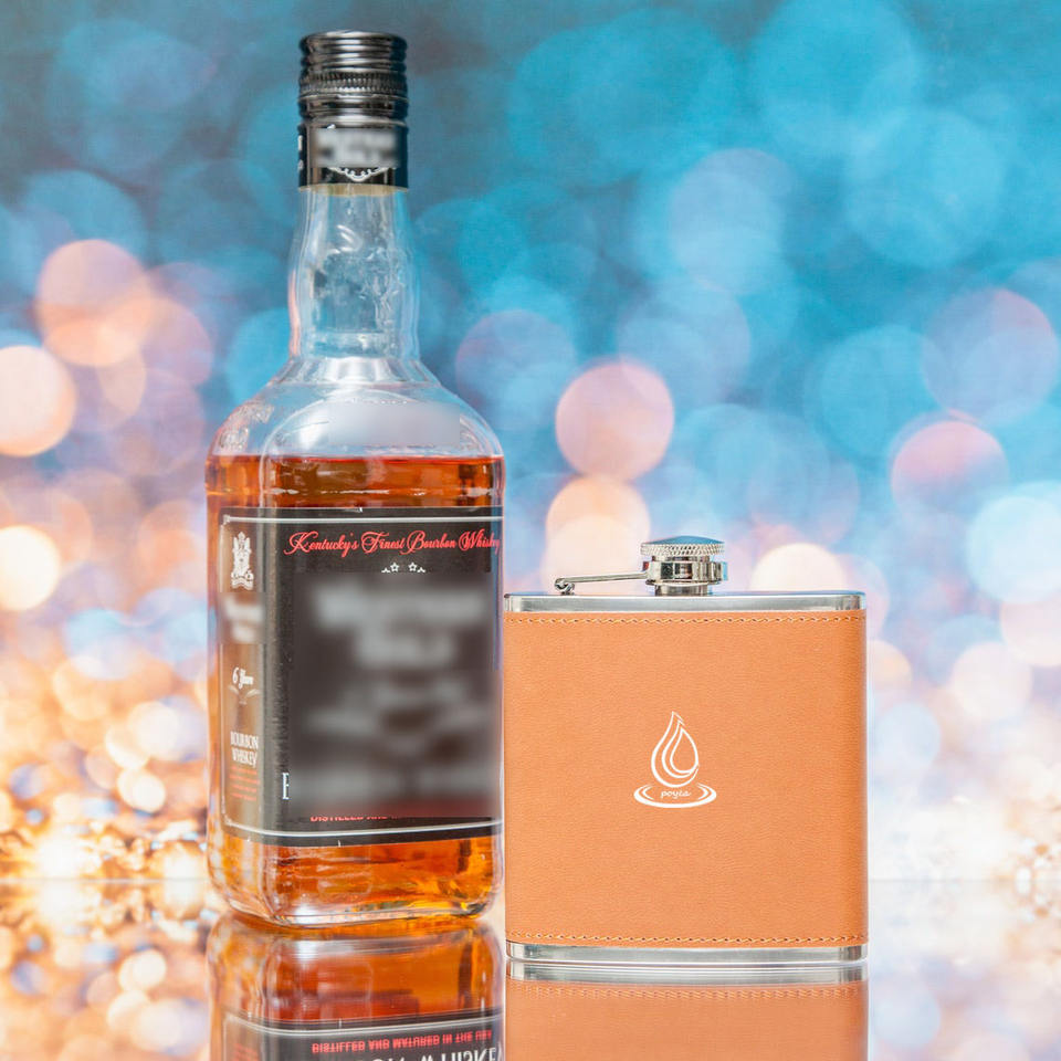 กระติกน้ำวิสกี้แบบพกพา ขนาด 7 ออนซ์ ทำจากสแตนเลสเก็บความร้อน พร้อมกรวย หุ้มหนัง PU ปรับแต่งสีและโลโก้ได้ เหมาะสำหรับการเดินทาง