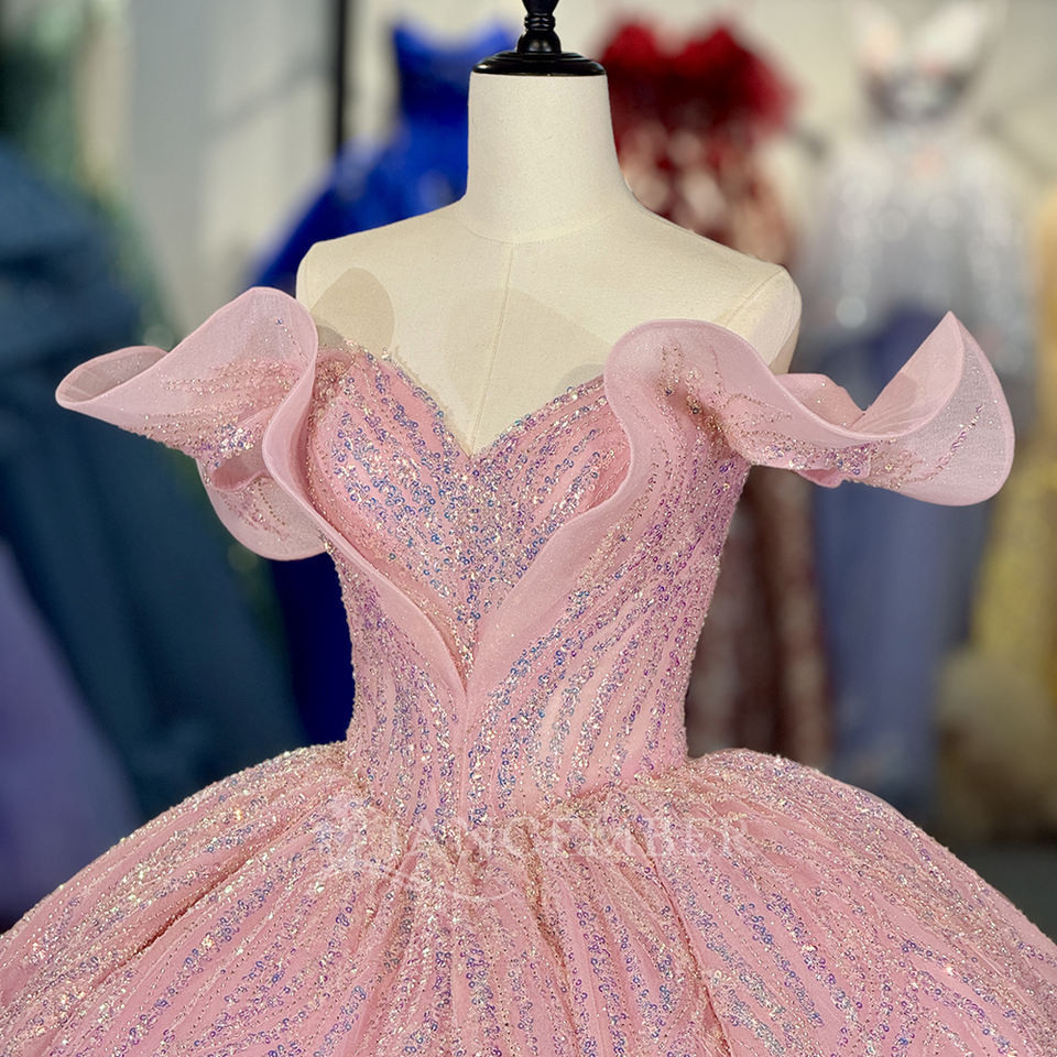 ชุดเดรสออกงานเลี้ยงตอนเย็นเปิดไหล่ปักเลื่อมสีชมพูสวยงาม1344 Janceanera