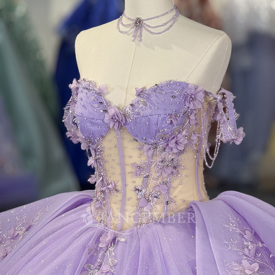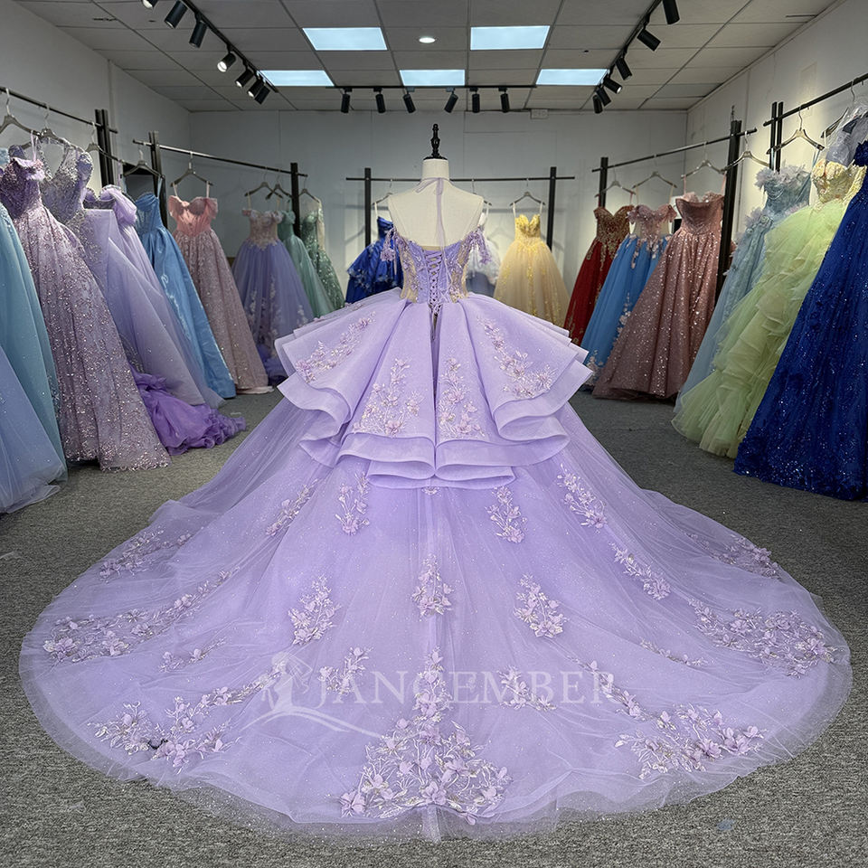 ชุดราตรีงาน Quinceanera สีม่วงไลแลคหรูหรา ประดับพู่ห้อยมุก แต่งลูกไม้ปักลาย ประดับด้วยลูกปัด ยาวลากพื้น พร้อมชายกระโปรงยาวแบบ Chapel Train รุ่น 202592