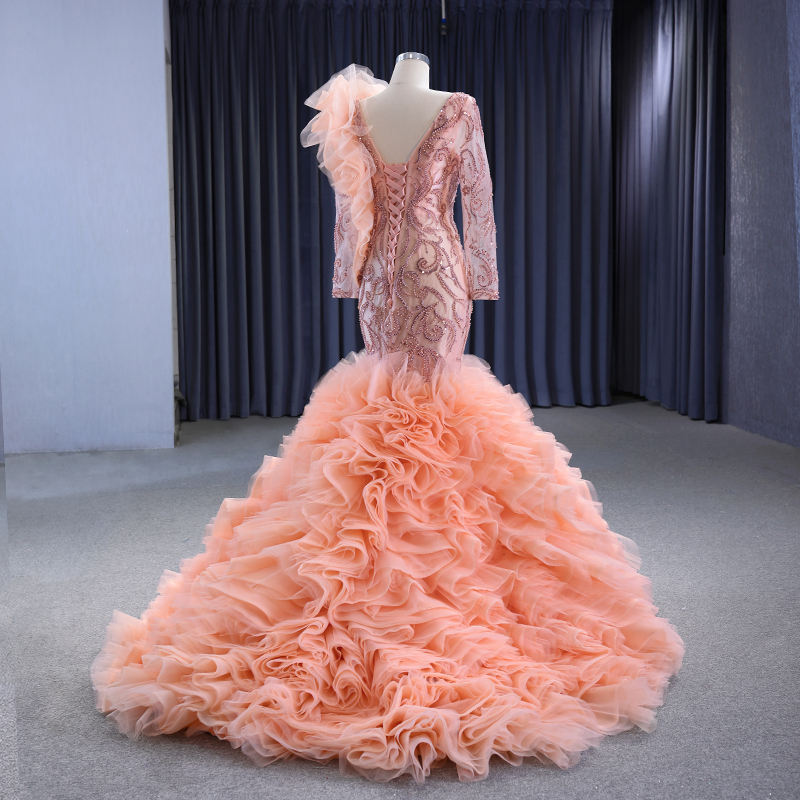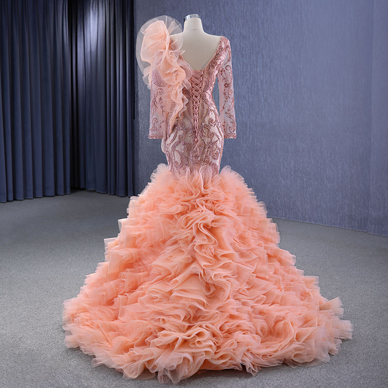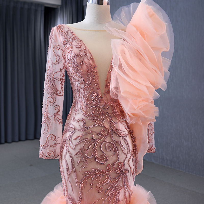 ชุดเดรสออกงานกลางคืนทรงนางเงือกลูกไม้สีชมพูกุหลาบแขนยาวมีสไตล์222146จาก Jancember