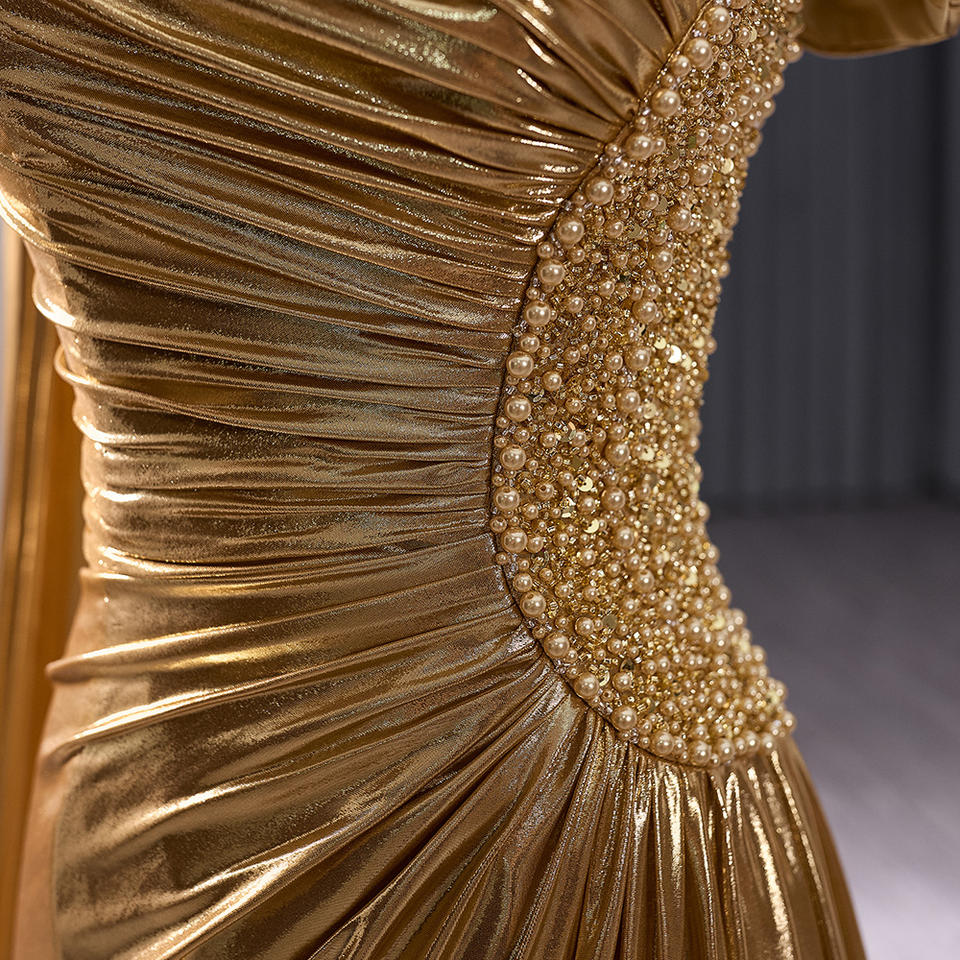 ชุดราตรีทรงเมอร์เมดหรูหราสีทอง รุ่น 241032 สำหรับคุณแม่ตั้งครรภ์ ดีไซน์พลีทระบายแบบธรรมชาติ พร้อมชายกระโปรงยาวแบบชาเปล สำหรับผู้หญิง