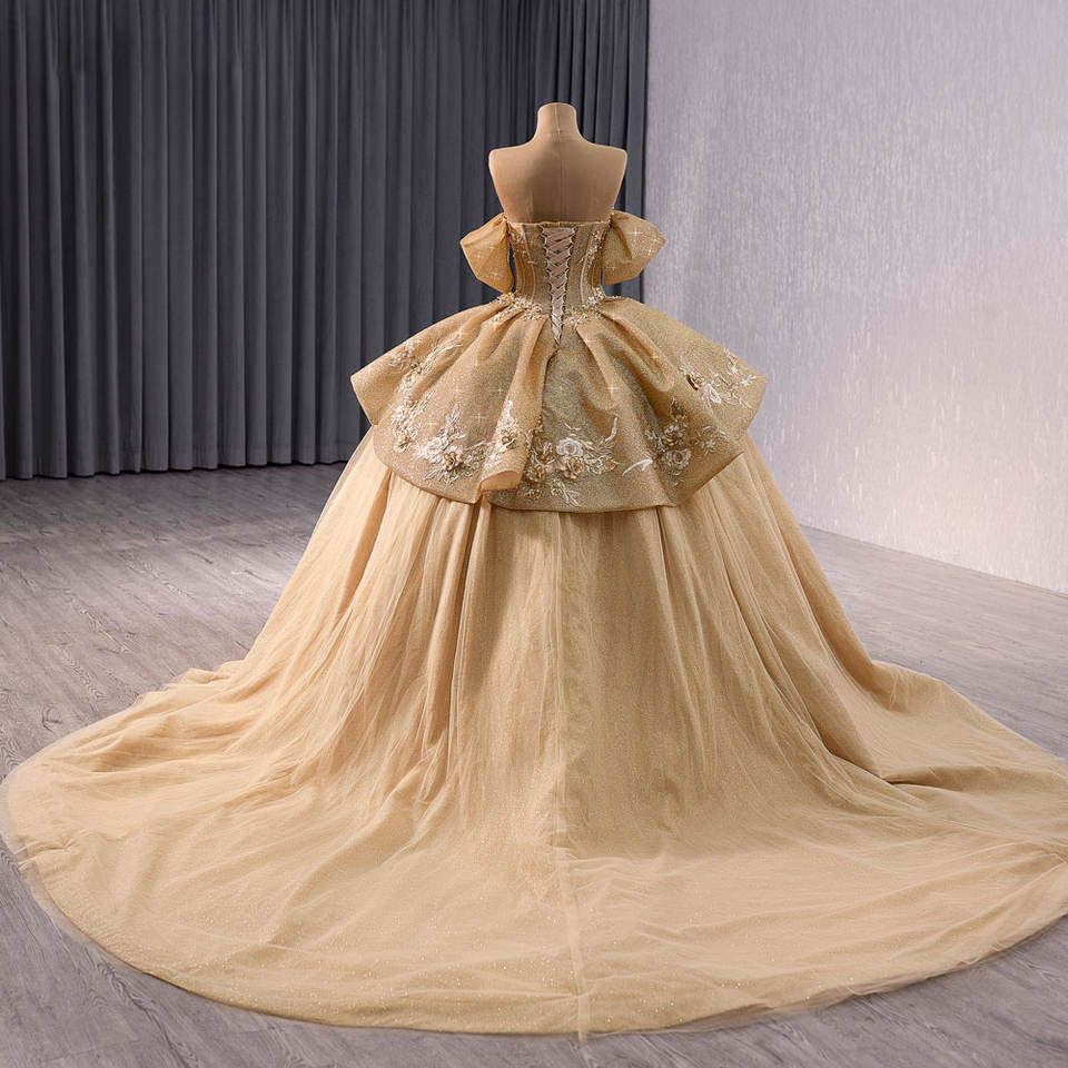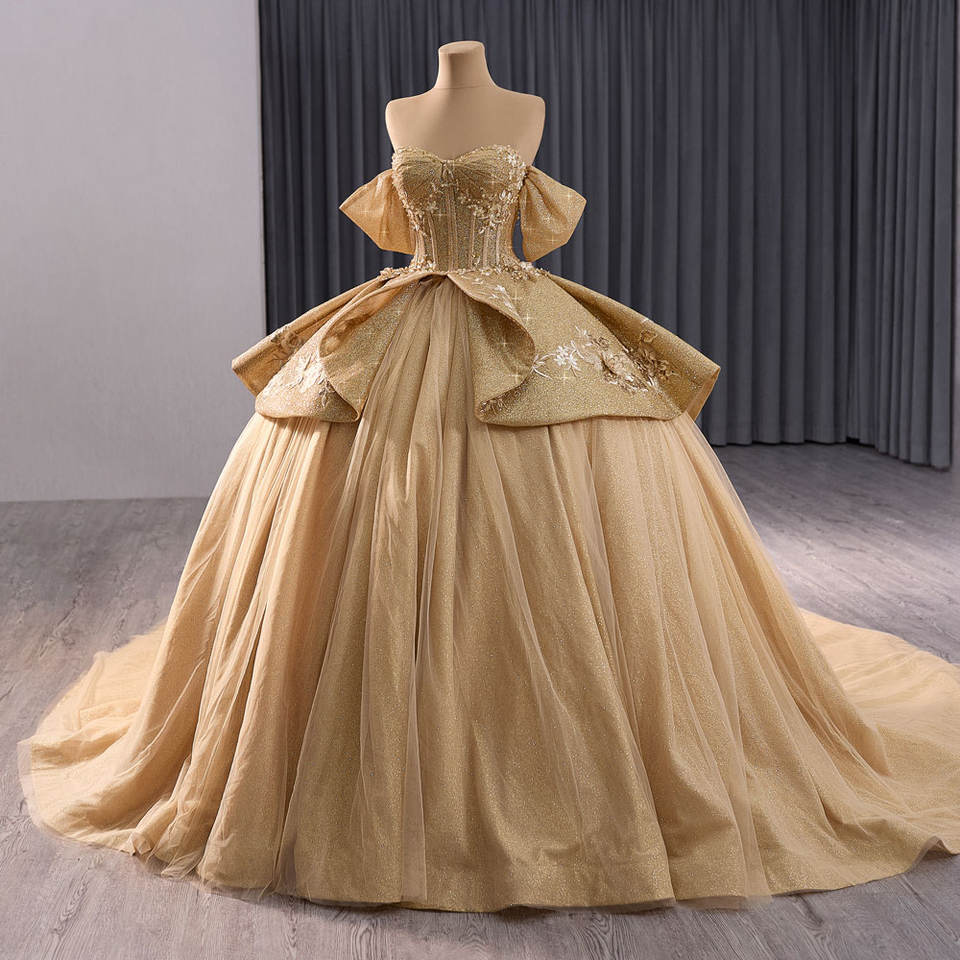 ชุดราตรีทรงบอลกาวน์ประดับลูกไม้สีทองวิบวับแบบโมเดิร์น รุ่น 241056 พร้อมงานปักลายดอกไม้ ชายกระโปรงยาวแบบชาเปล คอรูปหัวใจ ไซส์พลัส