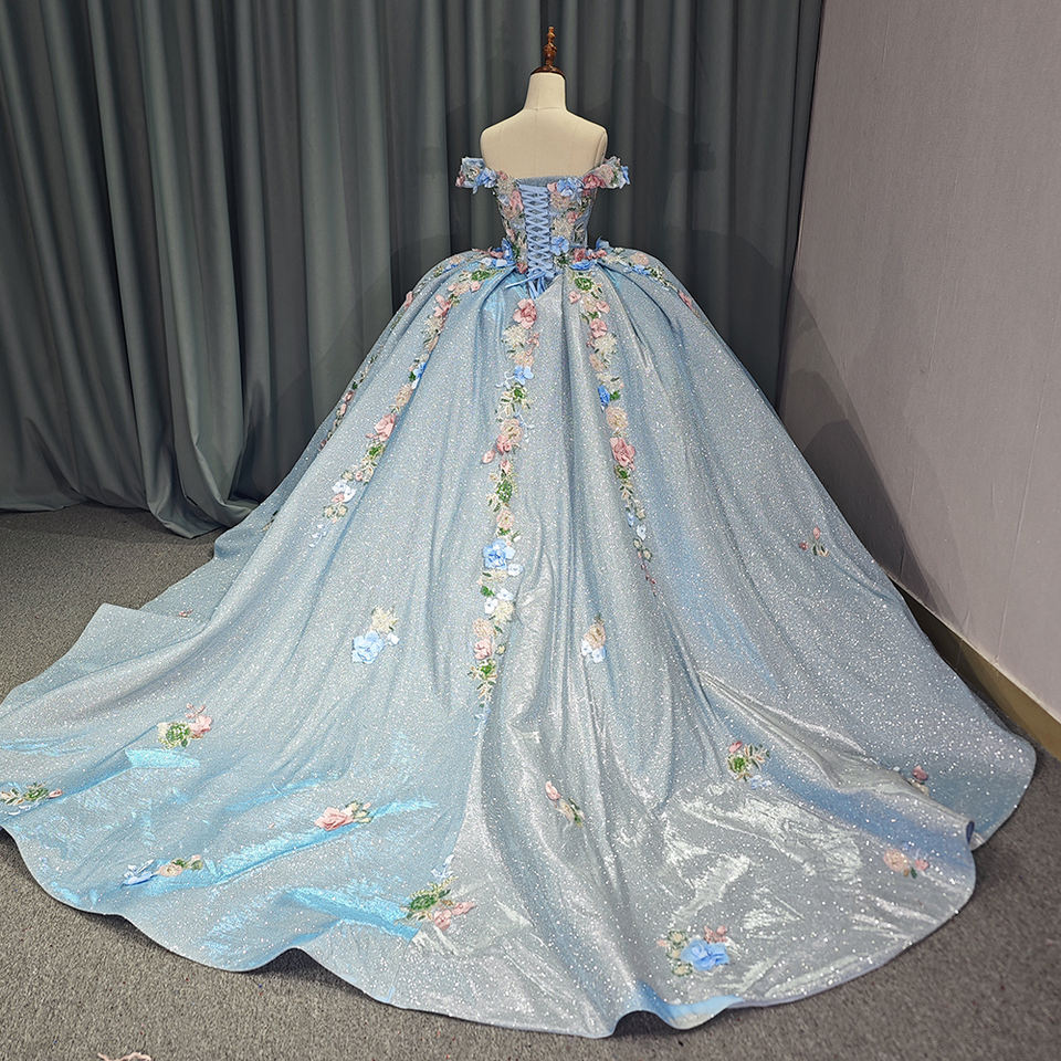 ชุดราตรีทรงบอลกาวน์แบบเอ็มไพร์ ประดับดอกไม้ แต่งลูกไม้ปักลาย พร้อมชายกระโปรงยาวแบบชาเปล มีบราในตัว สำหรับสาวอวบ ไซส์ 6767 รุ่นโมเดิร์น พลัสไซส์ ดีไซน์หวาน