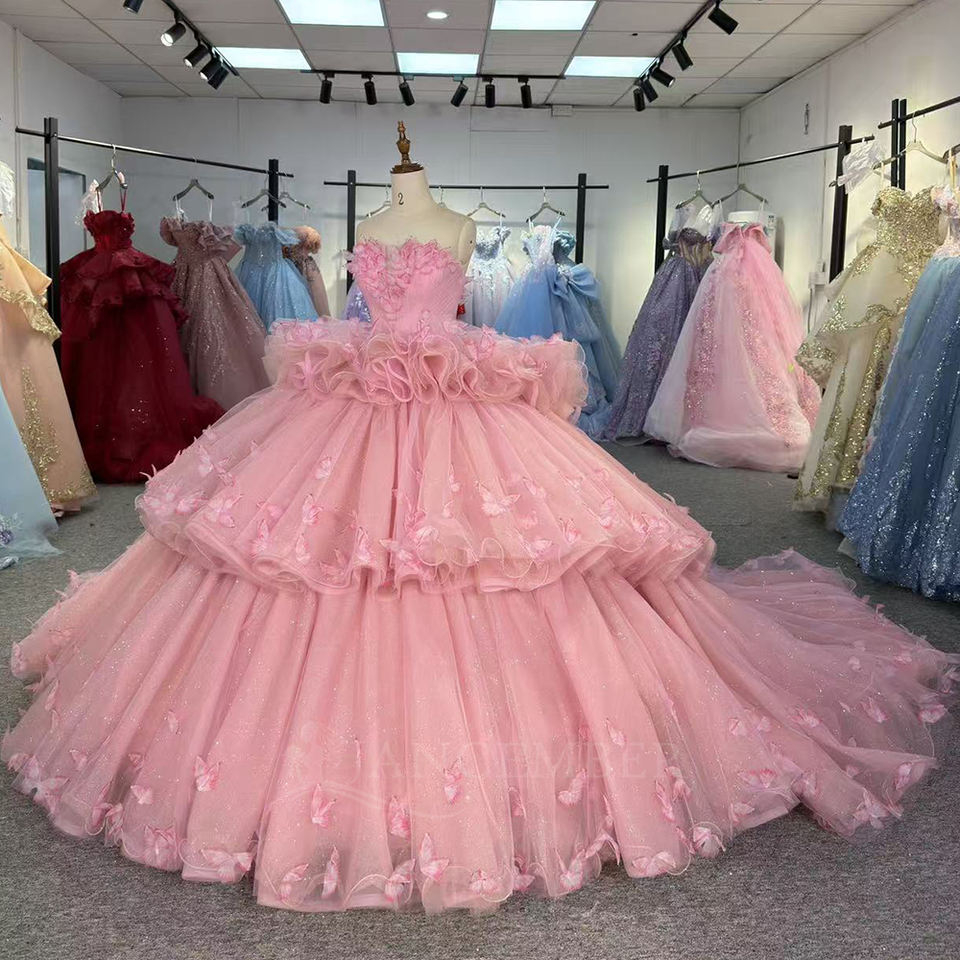 ชุดเดรสเค้กวันเกิดแบบพองๆลายผีเสื้อแขนกุดสีชมพูสำหรับเจ้าหญิง6892 Janceanera