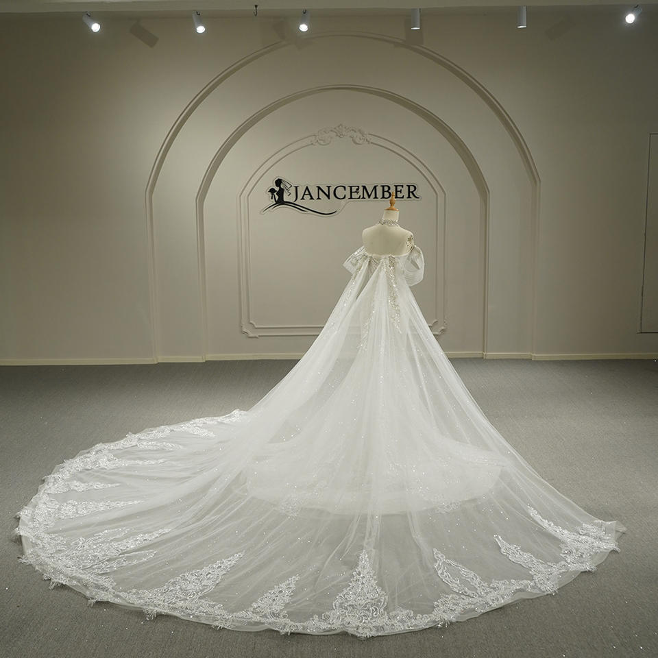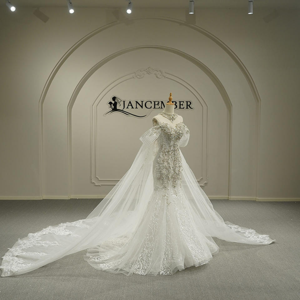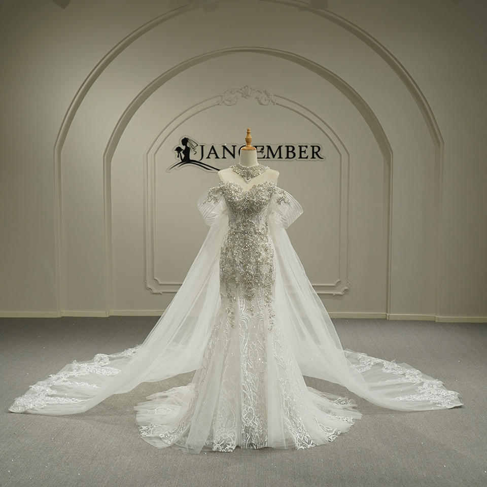 ชุดแต่งงานทรงเมอร์เมดแบบยาวลากพื้น รุ่น GT26051 ดีไซน์ทันสมัย สวยสง่า ประดับเลื่อมและลูกปัด พร้อมผ้าคลุมแบบเคปและลายดอกไม้