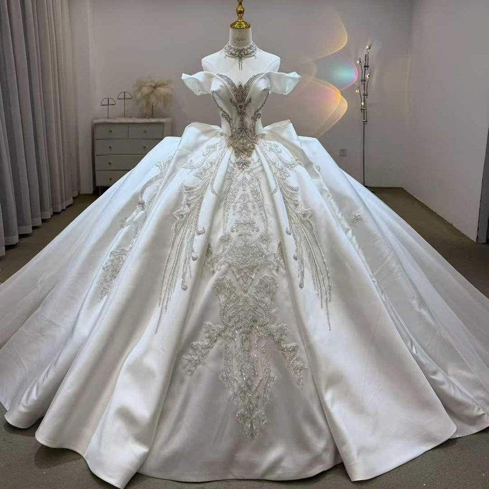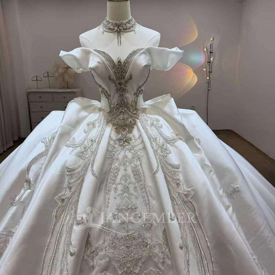 ชุดแต่งงานหรูหรา Jancember JJ123 ผ้าซาตินประดับลูกปัด ชุดเจ้าสาวแบบเปิดไหล่ทรงบอลกาวน์ ชุดแต่งงานแบบ Cathedral
