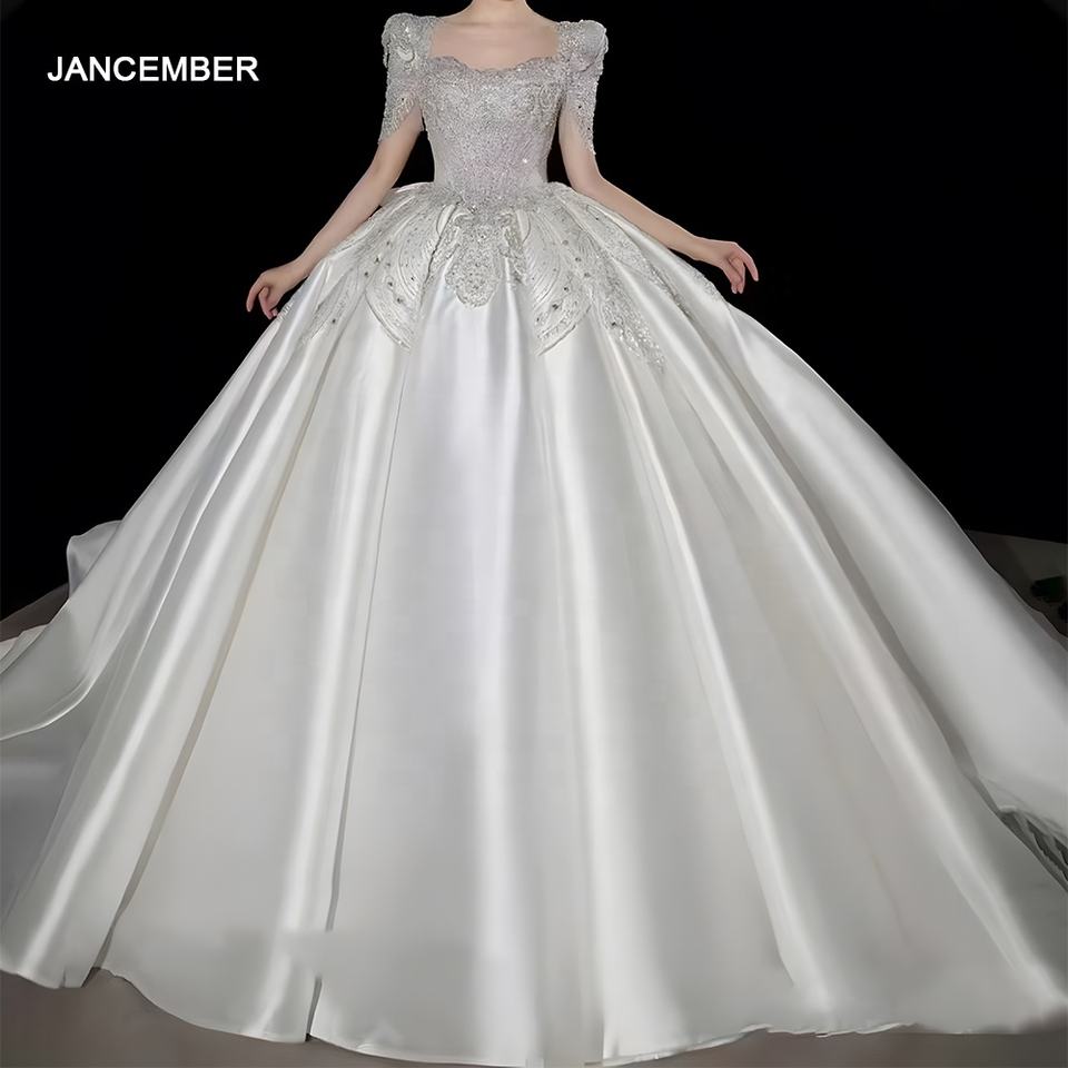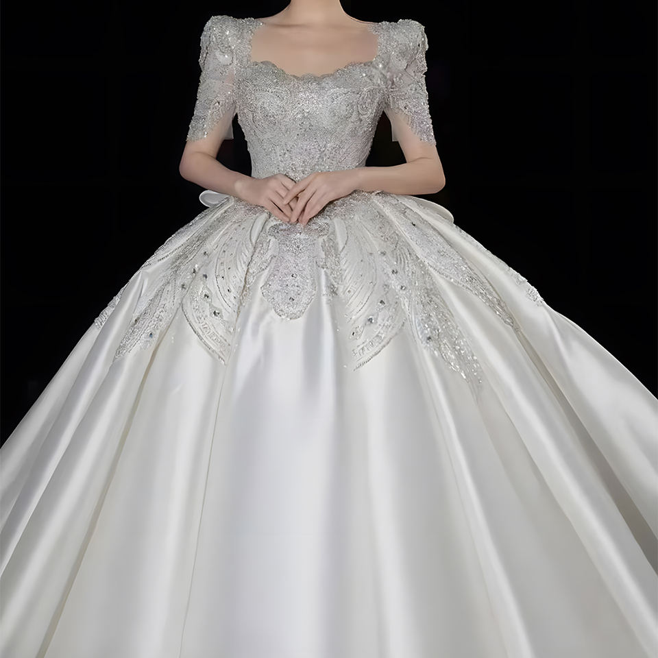 ชุดเดรสแต่งงานผ้าซาตินแขนสั้นปักลายติดเพชร LSHT011