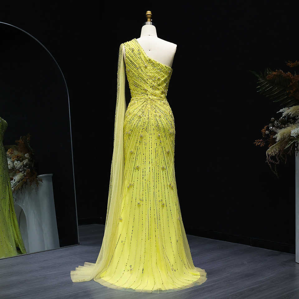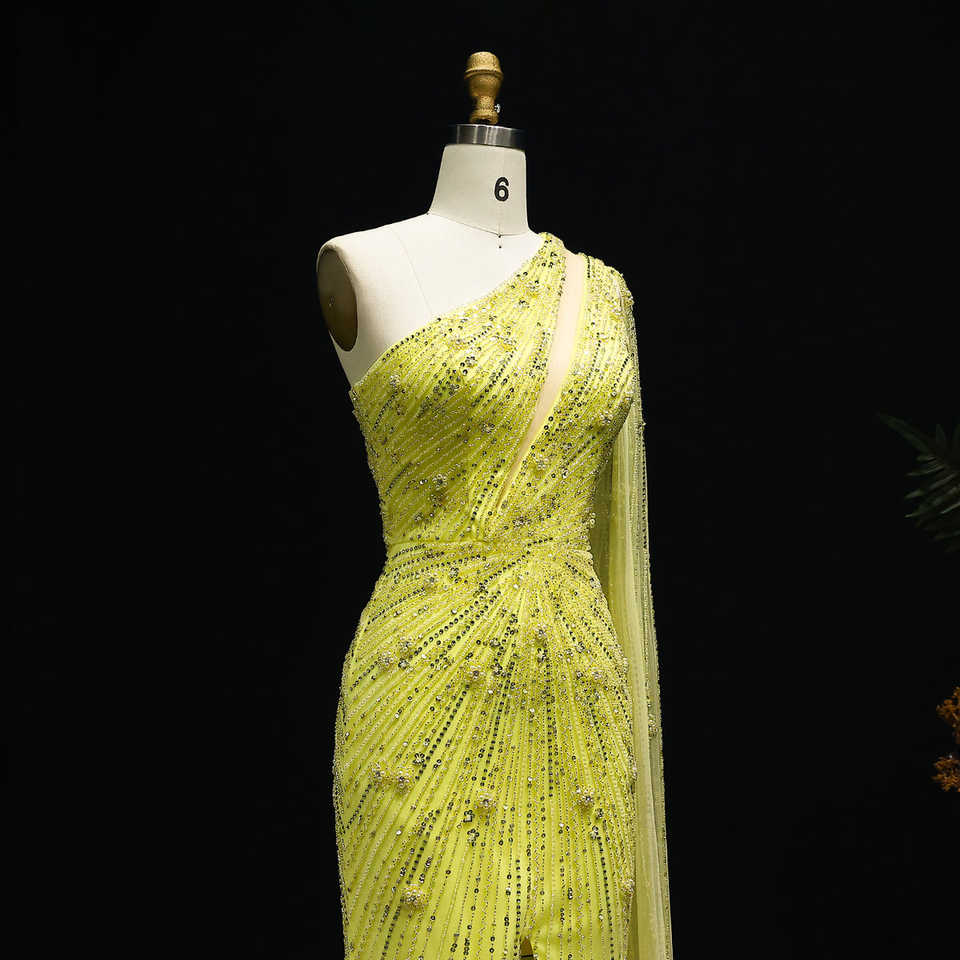 Jancember ชุดราตรีเข้ารูปปักไข่มุกสีเหลืองเปิดไหล่ข้างเดียวมี LSZ317แวววาว
