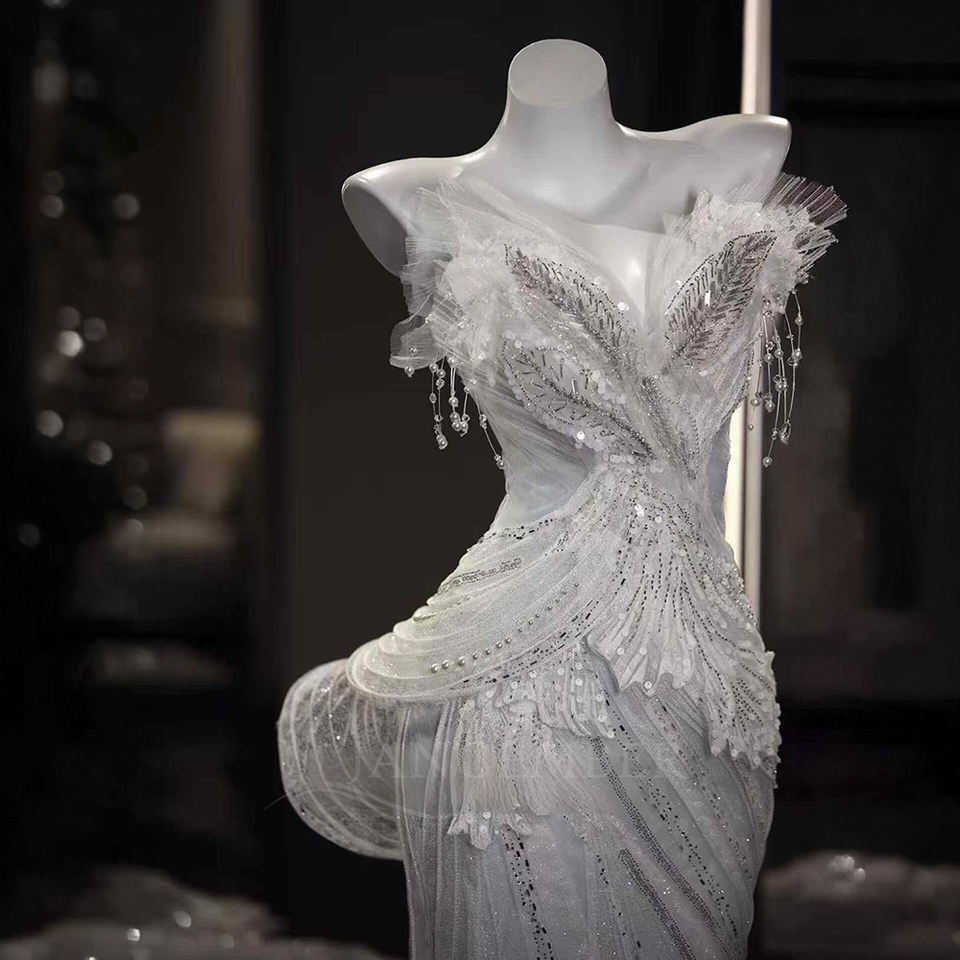ชุดแต่งงานพู่ห้อยนางเงือกยาวถึงพื้นประดับคริสตัลรูปดอกไม้สำหรับ NT45ทันสมัยมีสไตล์