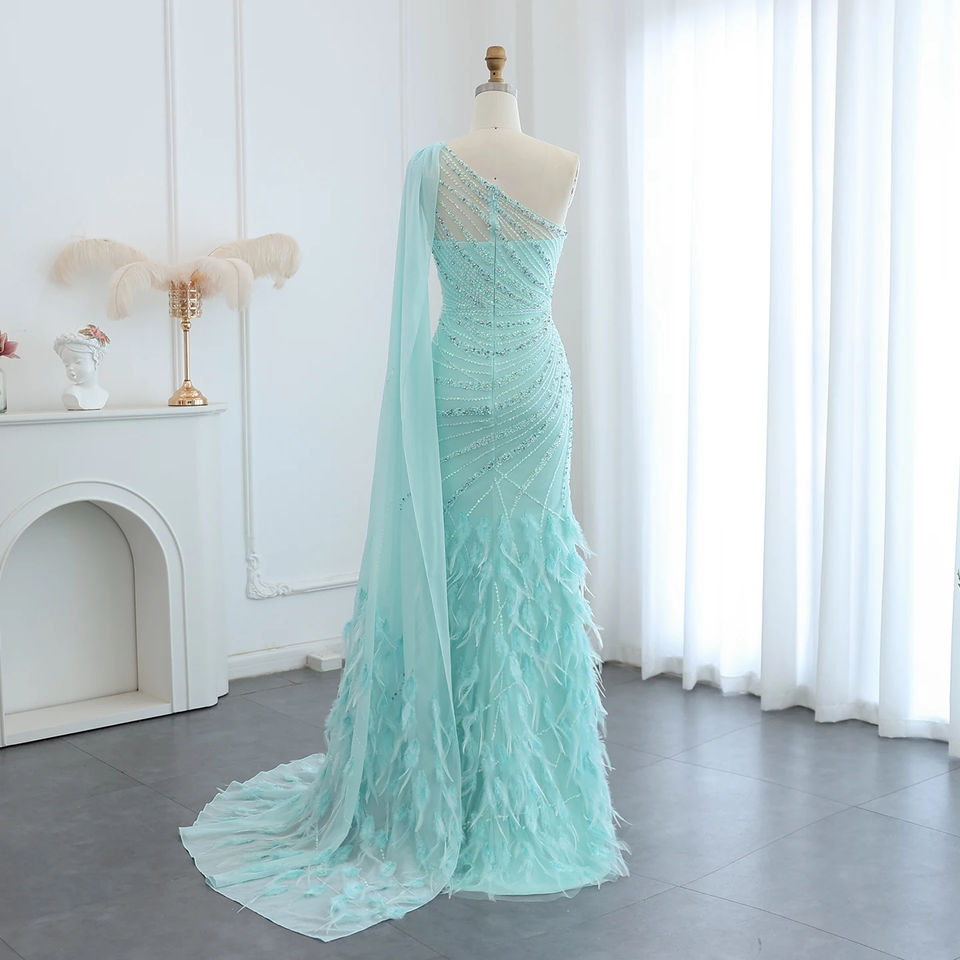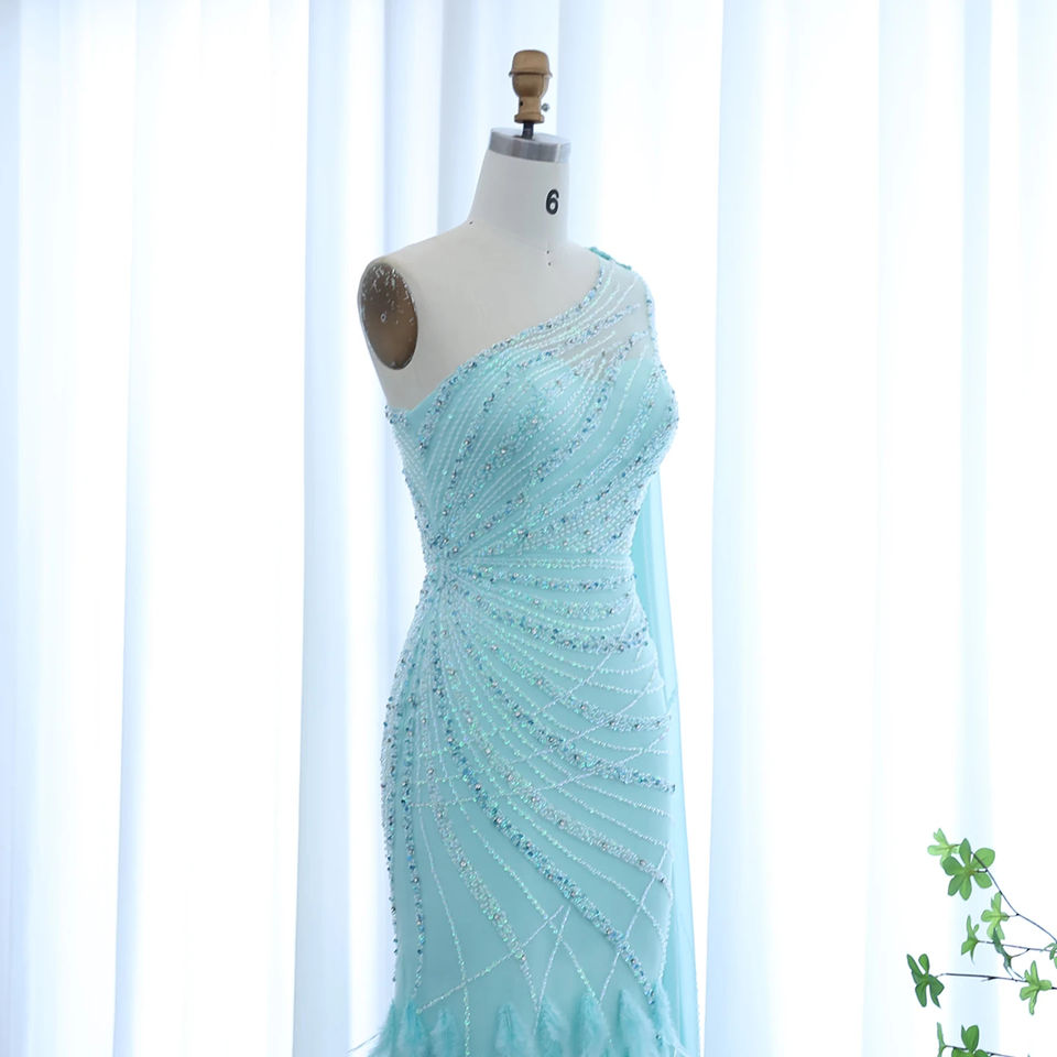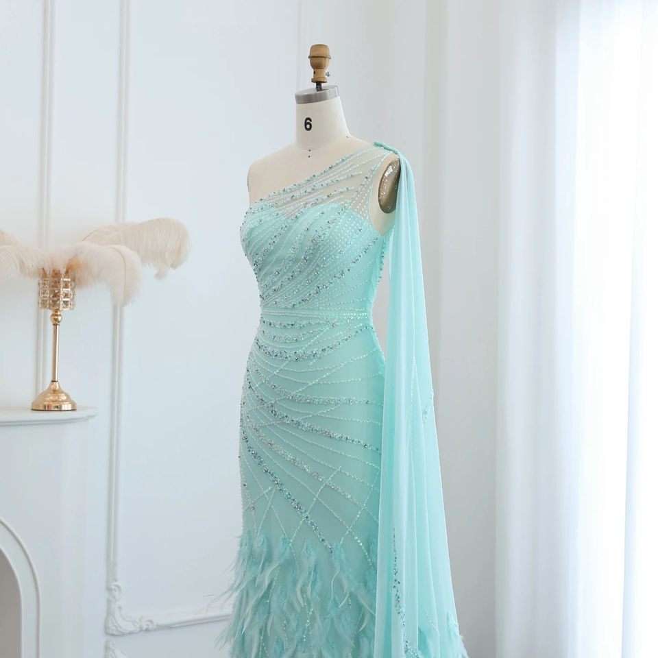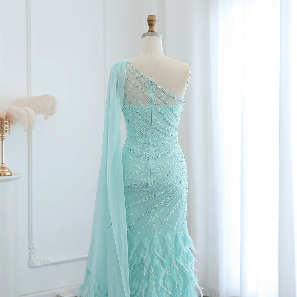 ชุดราตรีหรูหรา SZ498 สีฟ้าอมเขียวประดับขนนก ตกแต่งด้วยคริสตัลและเลื่อมแบบ 3 มิติ ทรงเมอร์เมด ยาวกรอมพื้น ระบายอากาศได้ดี เหมาะสำหรับงานปาร์ตี้ งานพรอม