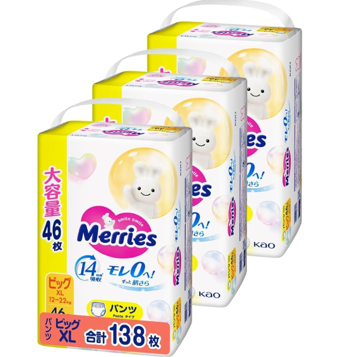 ผ้าอ้อมเด็กแบบกางเกงยี่ห้อ KAO ของแท้จากญี่ปุ่น ไซส์ XL 46 ชิ้น 3 แพ็ค ป้องกันการรั่วซึมแบบ 3 มิติ นุ่ม ระบายอากาศได้ดี