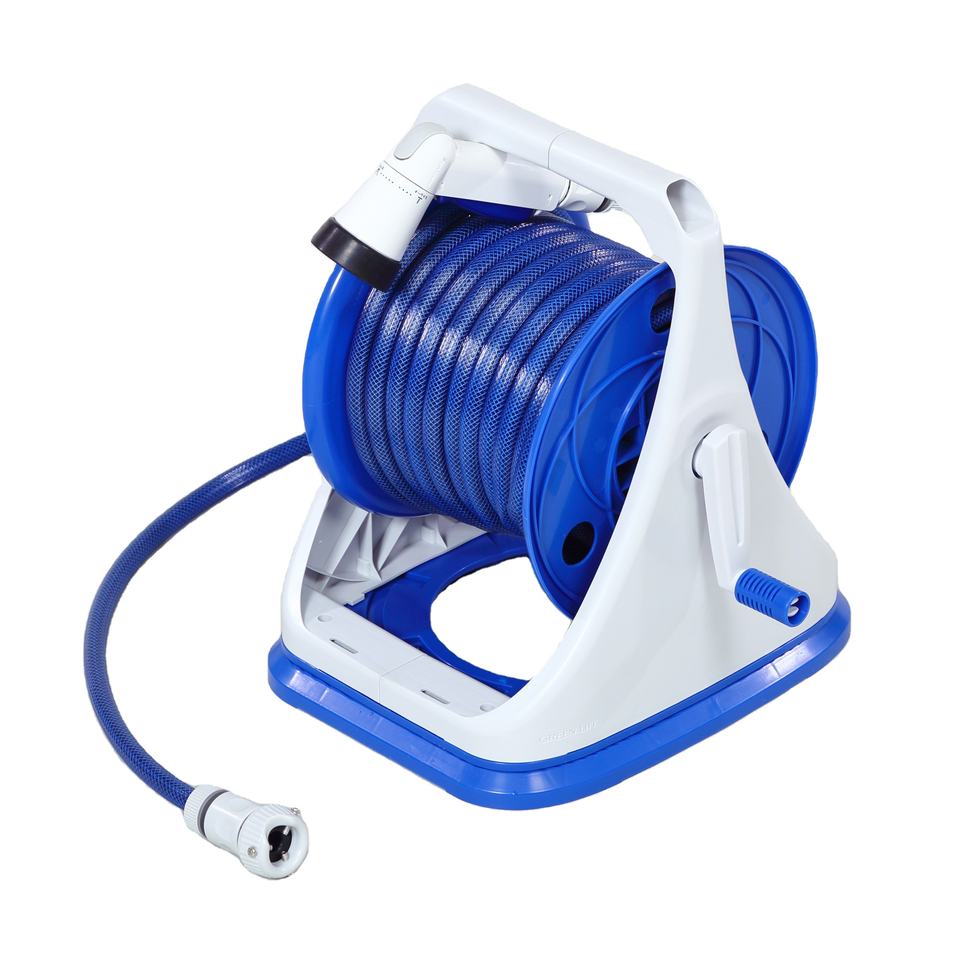 รีลท่อส่งน้ำแบบพกพา20เมตรแบบแมนนวลฐานหมุนปรับ5L ความจุสำหรับล้างรถทำสวน-สีเขียว