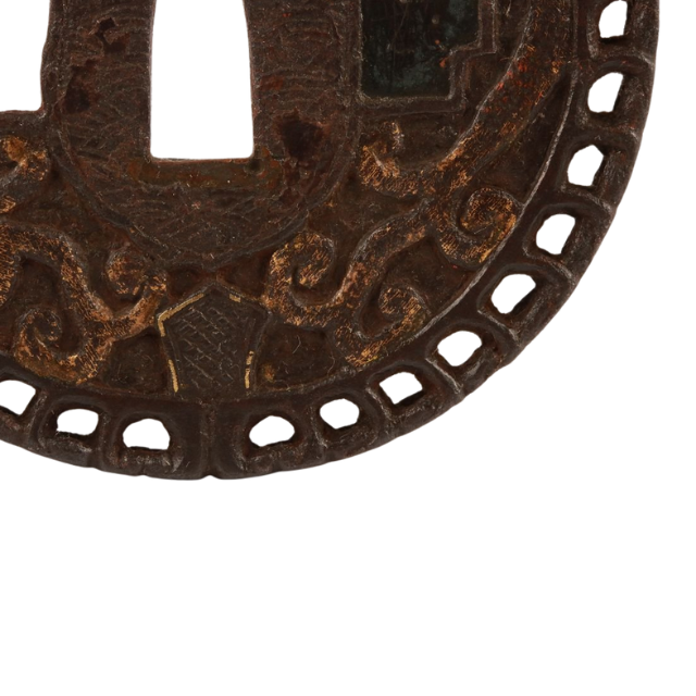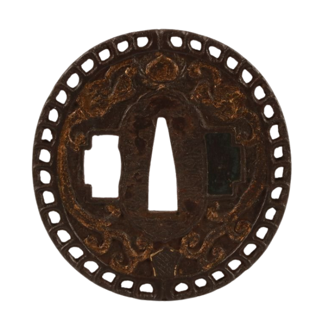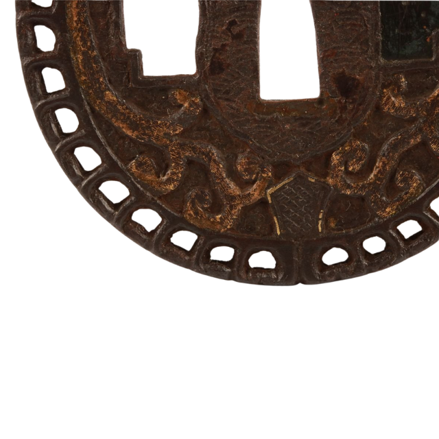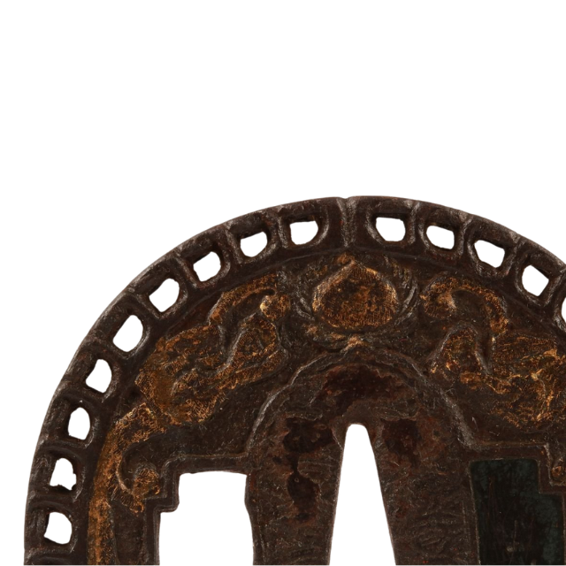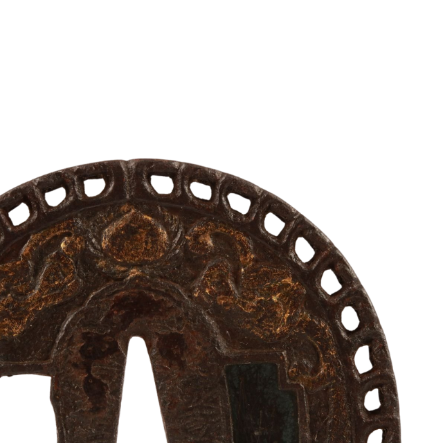 ที่ครอบดาบโบราณญี่ปุ่นยุคเอโดะ แบบขัดเงา ทาสี ลายเหล็กอิโร่ คาราคุสะ (ลายอาราเบสก์) ดีไซน์นัมบัน ซุคาชิ ไม่มีตราประทับ