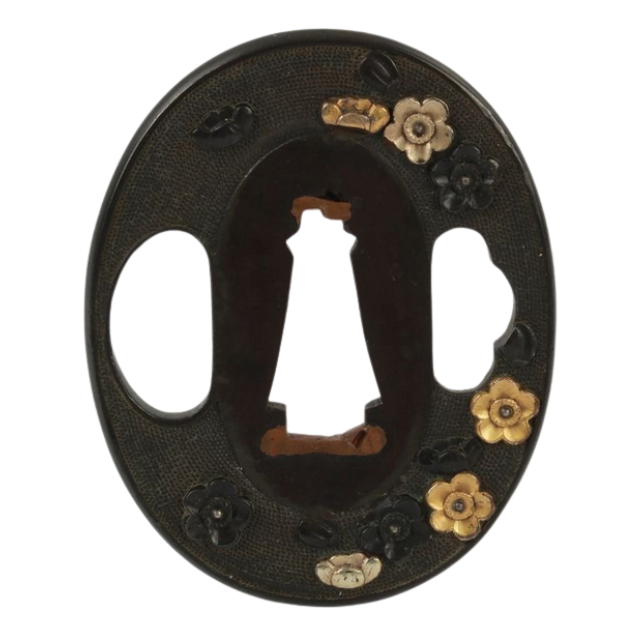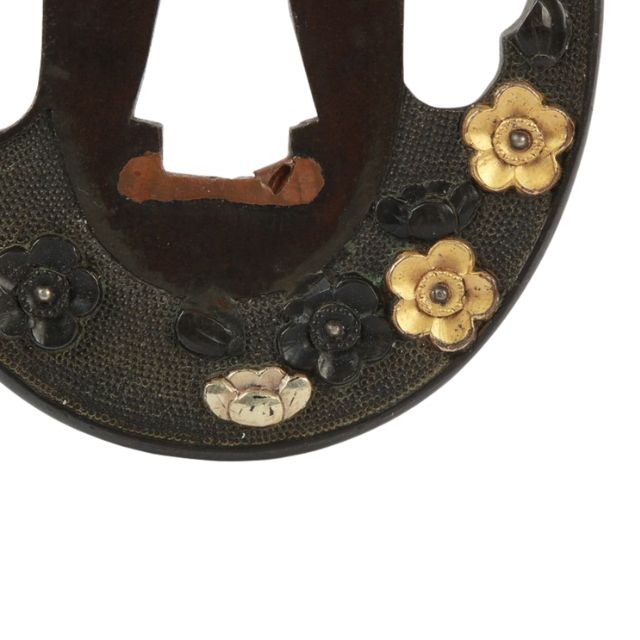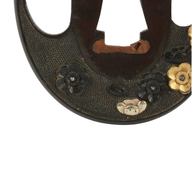 ที่ครอบดาบโบราณยุคเอโดะของญี่ปุ่น ทำจากทองแดงสีแดงขัดเงา ประดับด้วยทองและเงินลายดอกไม้ ไม่มีตราประทับ สำหรับดาบตันโต