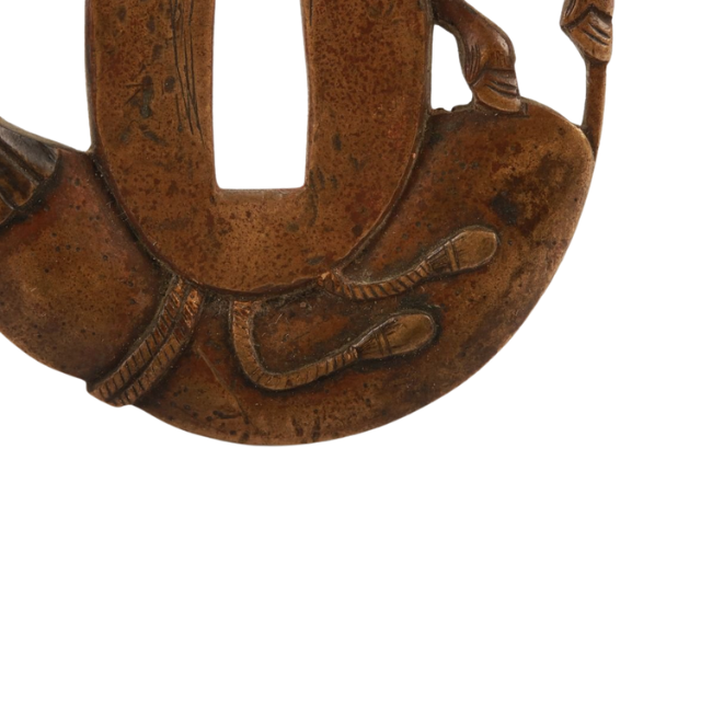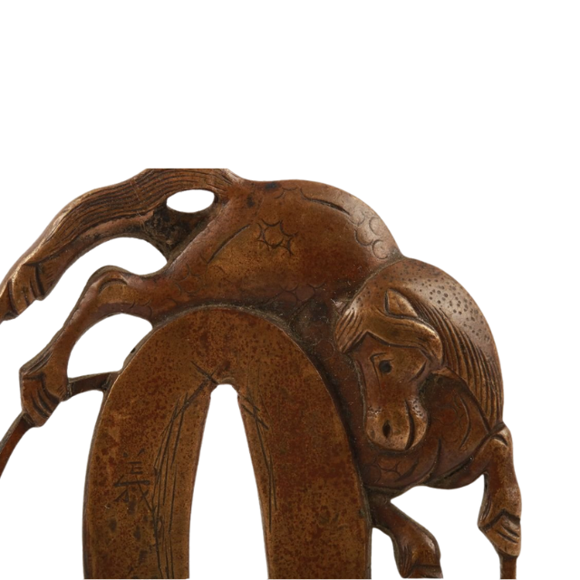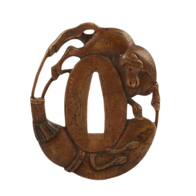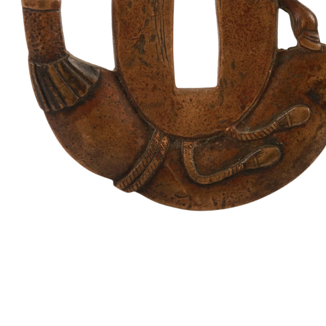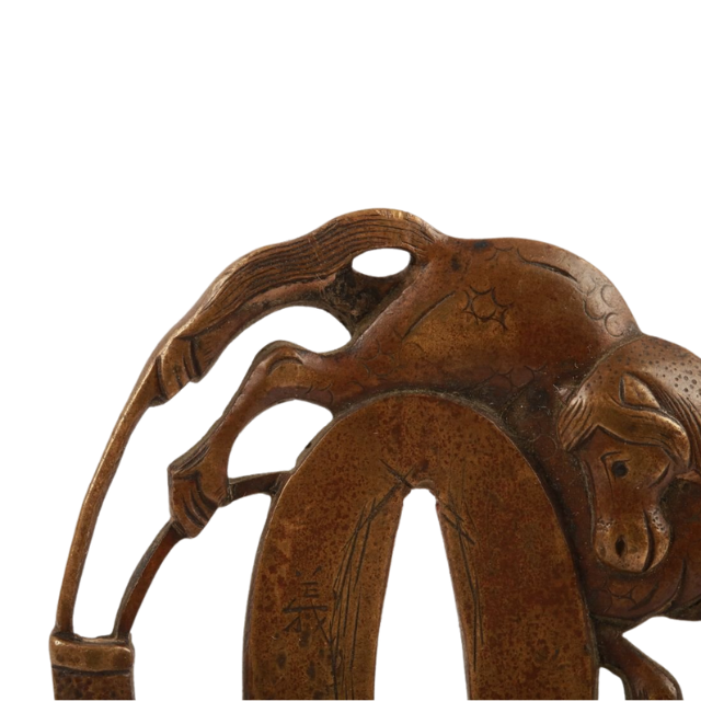 ที่ครอบดาบโบราณแบบญี่ปุ่นยุคเอโดะ ยี่ห้อซึบา โยชิโทโมะ ทำจากทองแดงขัดเงา ลายมะระและม้า ซูกาชิ รูปทรงไม่สมมาตร