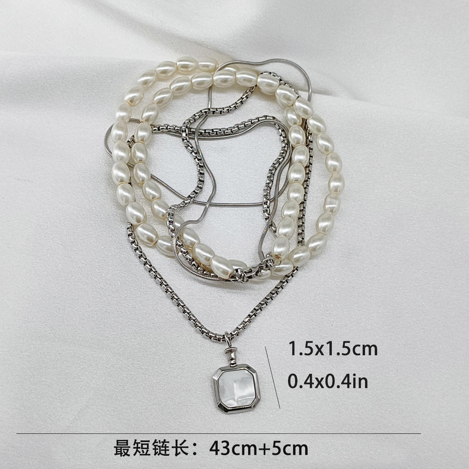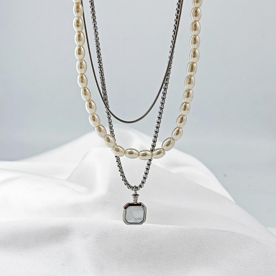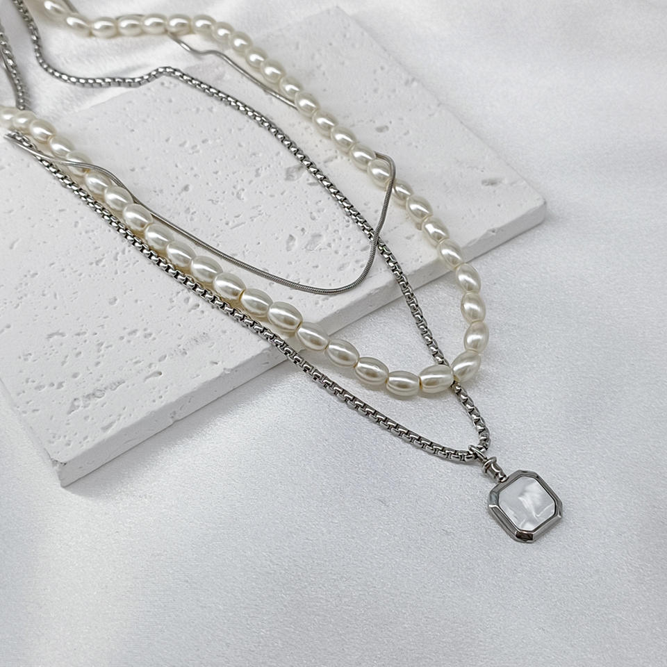 สร้อยคอสามชั้นประดับจี้ทรงสี่เหลี่ยมประดับมุกเทียมสไตล์ญี่ปุ่นเกาหลี ทำจากไทเทเนียมสตีล สำหรับผู้ชายและผู้หญิง