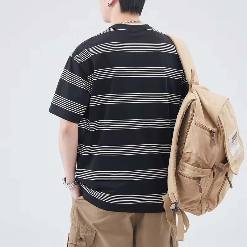 เสื้อยืดพิมพ์ลายทางสไตล์เรโทรสไตล์ญี่ปุ่นสำหรับผู้ชายสไตล์ลำลองพร้อมพิมพ์ดิจิตอลดีไซน์คอแขนสั้นทรงหลวม