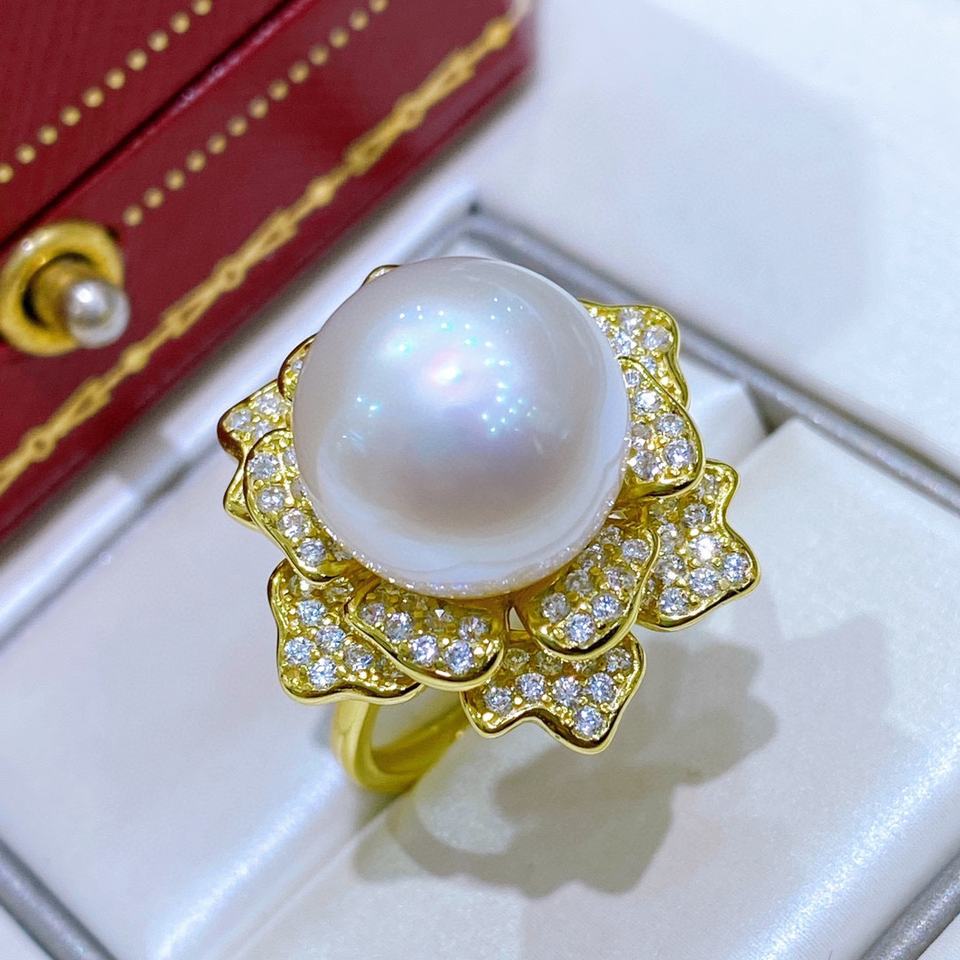 แหวนไข่มุกธรรมชาติสีเงิน 12-11 มม. สไตล์ญี่ปุ่น แสงเย็น ประกายเงินแท้ รูปดอกไม้ พร้อมกล่องของขวัญ