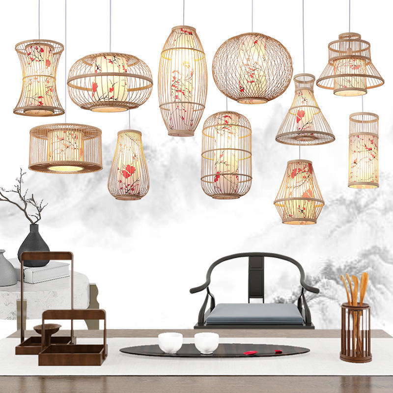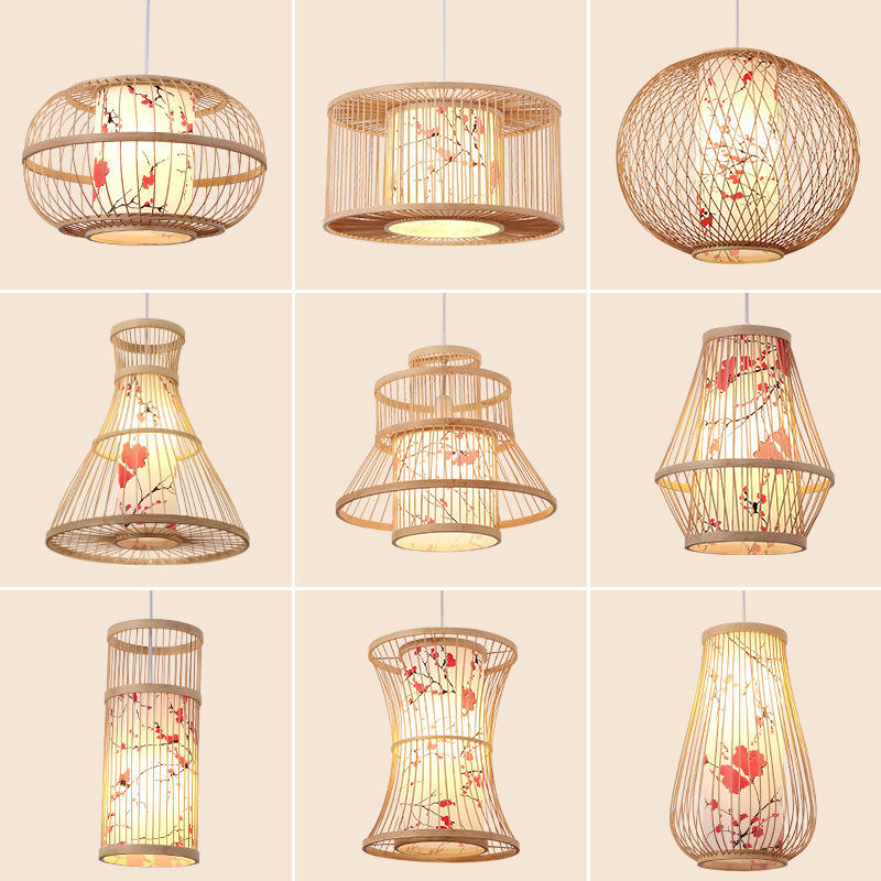 โคมไฟระย้าไม้ไผ่สไตล์ญี่ปุ่นทรงกลม E27 LED หัวเดียว สำหรับร้านอาหาร ระเบียง ทางเดิน ไฟตกแต่ง