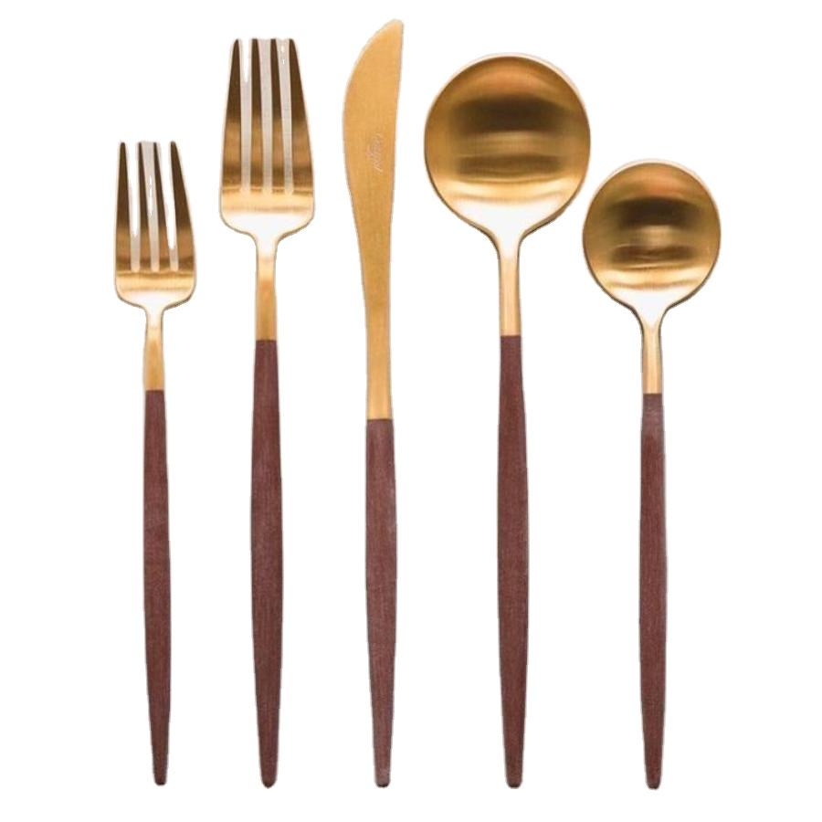 ชุดช้อนส้อมสไตล์ญี่ปุ่น 5 ชิ้น ชุบทอง สำหรับร้านอาหาร ชุดอุปกรณ์รับประทานอาหารโลหะ ด้ามไม้กระถิน ราคาโรงงาน