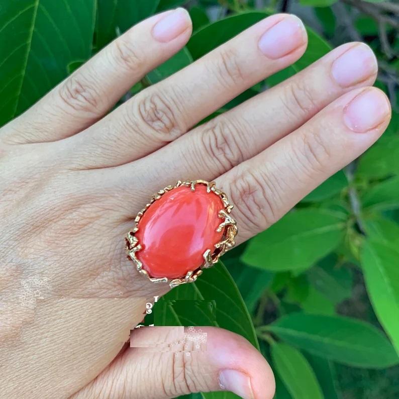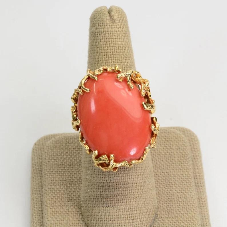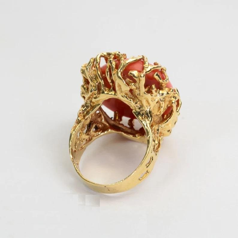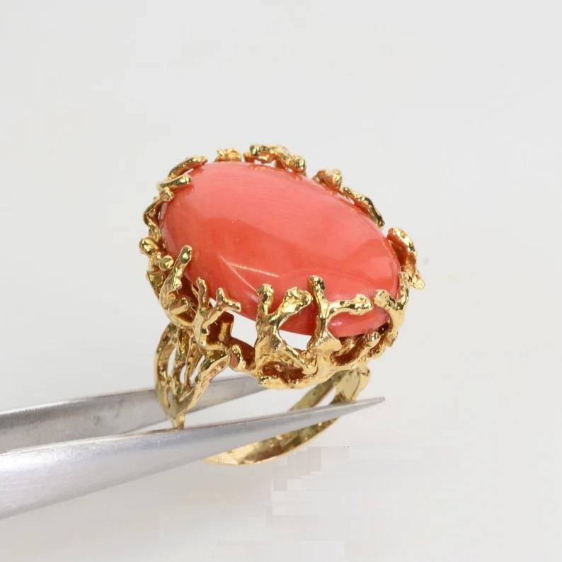 แหวนวินเทจญี่ปุ่น Momo Coral แท้14K สีเหลืองทอง18K ชุบทองสีส้มหินรูปไข่แหวนสำหรับผู้หญิงเครื่องประดับแฟชั่น