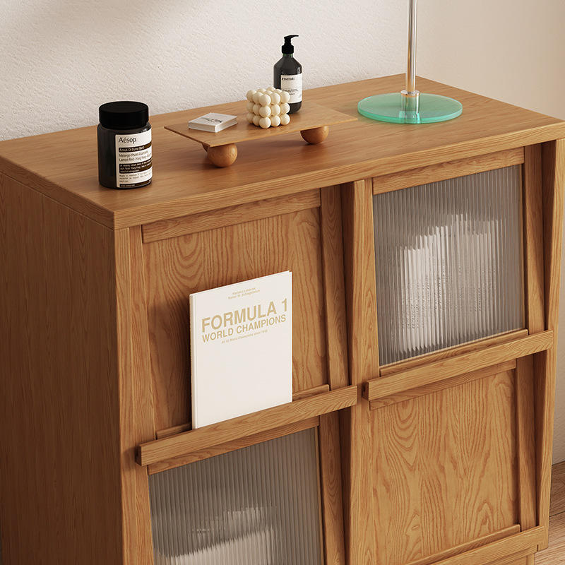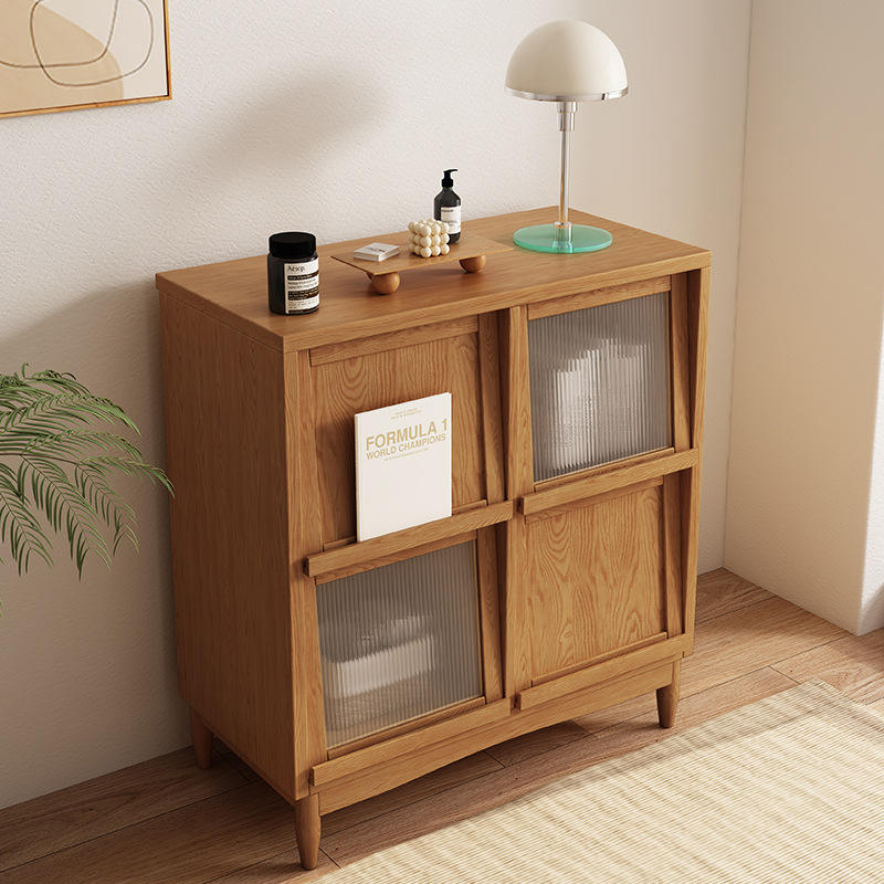 ตู้ลิ้นชักสไตล์ Wabi-Sabi สไตล์ญี่ปุ่นตู้ลิ้นชักไม้แข็งสี่บานพร้อมประตูกระจกสีรุ้งตู้เก็บเถ้าไม้สำหรับห้องนั่งเล่น