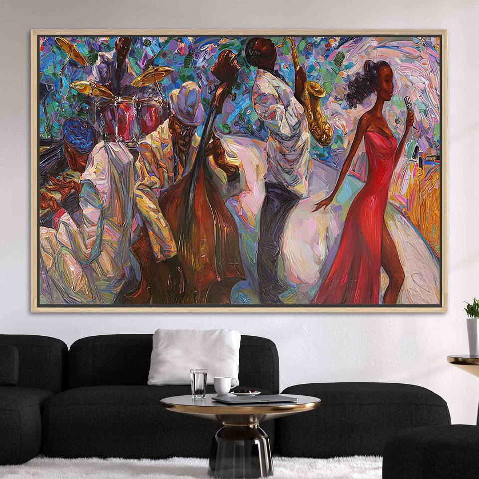 ผ้าใบพิมพ์ลายศิลปะดนตรีแจ๊ส - ของตกแต่งผนังรูปนักร้องชาวแอฟริกันสุดหรู,1P:กรอบสีทอง