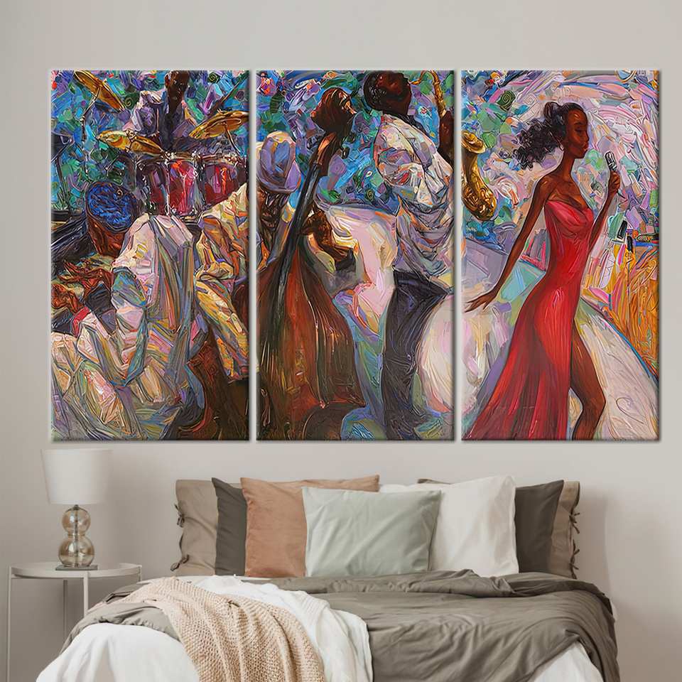 ภาพศิลปะติดผนังนักร้องเพลงแจ๊ส: ภาพพิมพ์บนผ้าใบ, นักดนตรีแจ๊สที่มีชีวิตชีวา, 3P: ห่อหุ้มแบบแกลเลอรี่